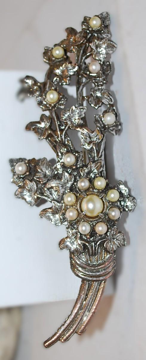 Beautiful Large VINTAGE "PEARL BOUQUET" BROOCH (4½" x 2") with 16 Faux Off-White Pearls on a Dark Silver Tone Solid Setting