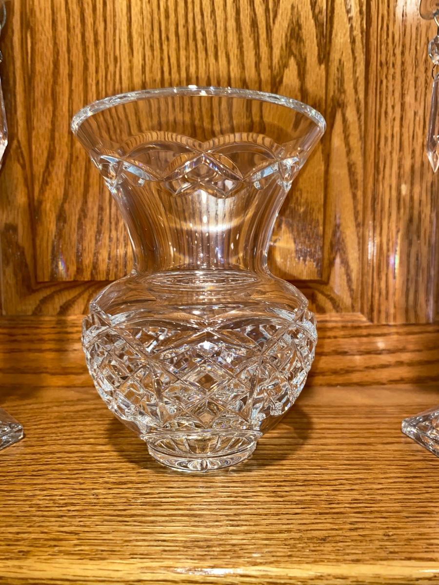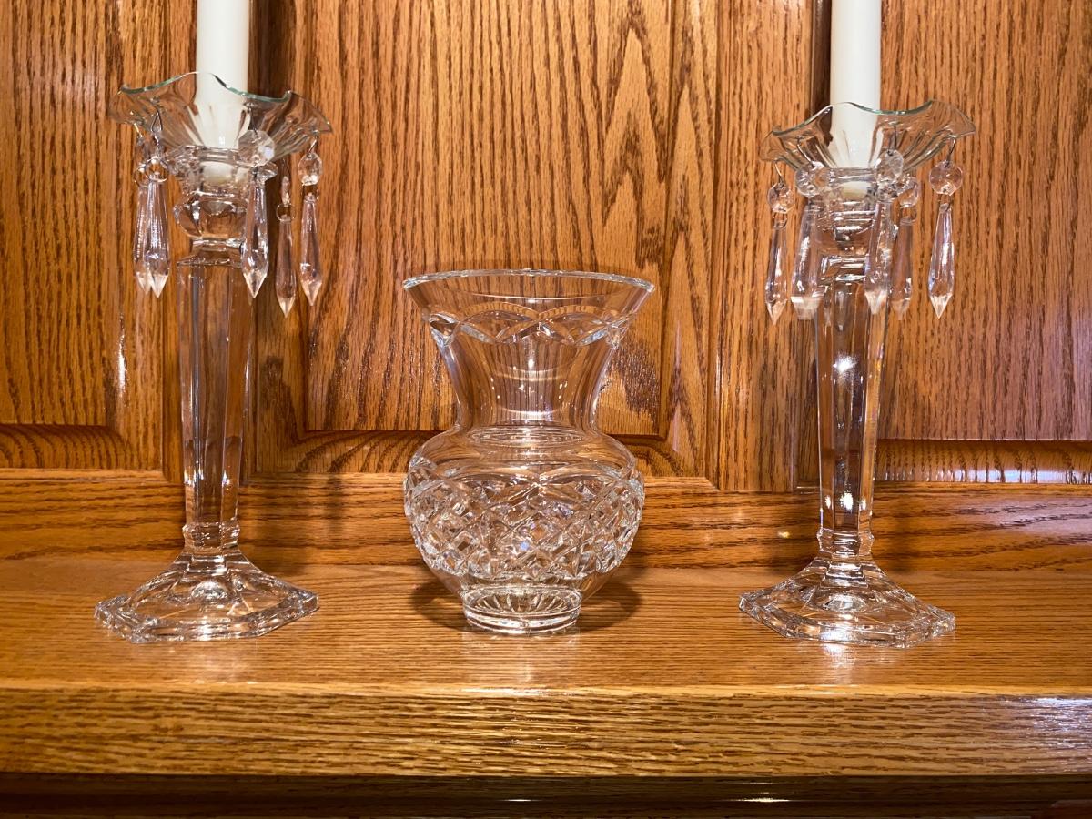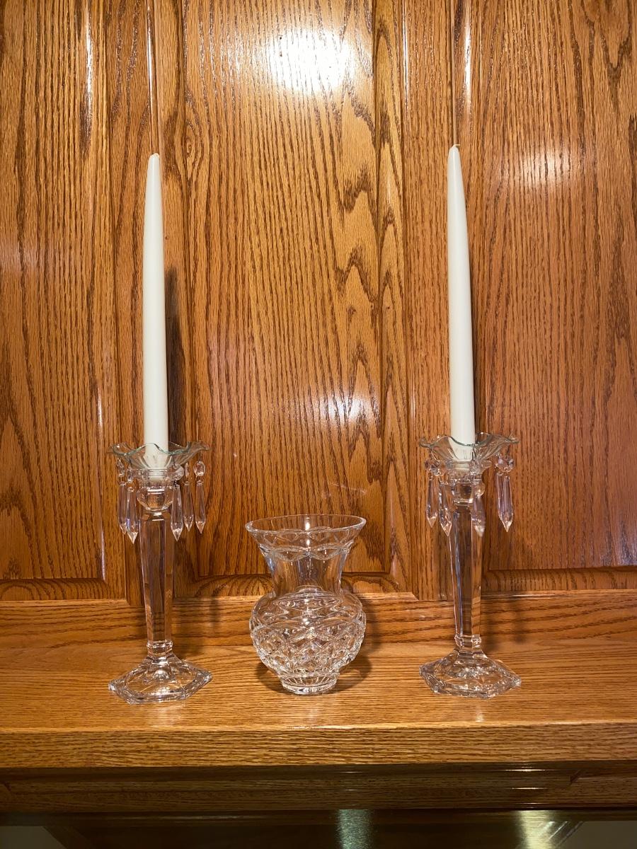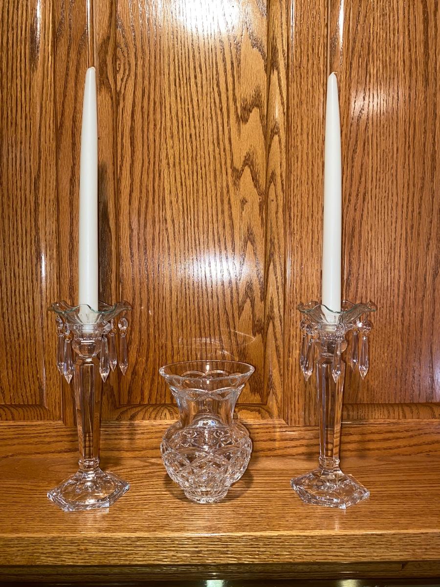 BEAUTIFUL LEAD CRYSTAL CANDLESTICK HOLDERS AND A CRYSTAL VASE