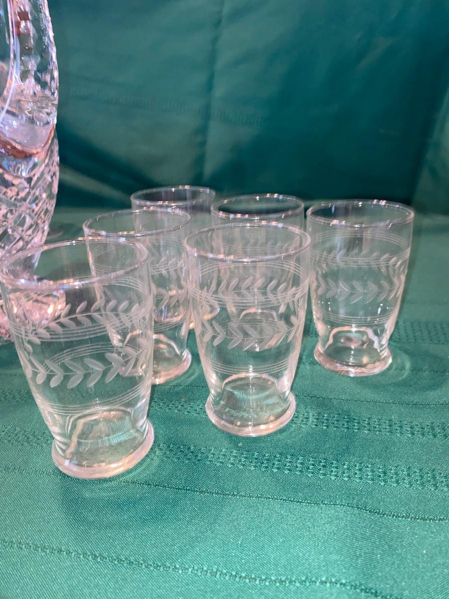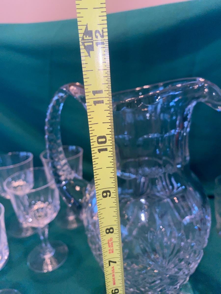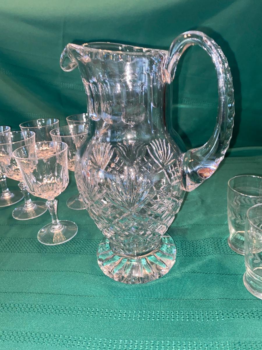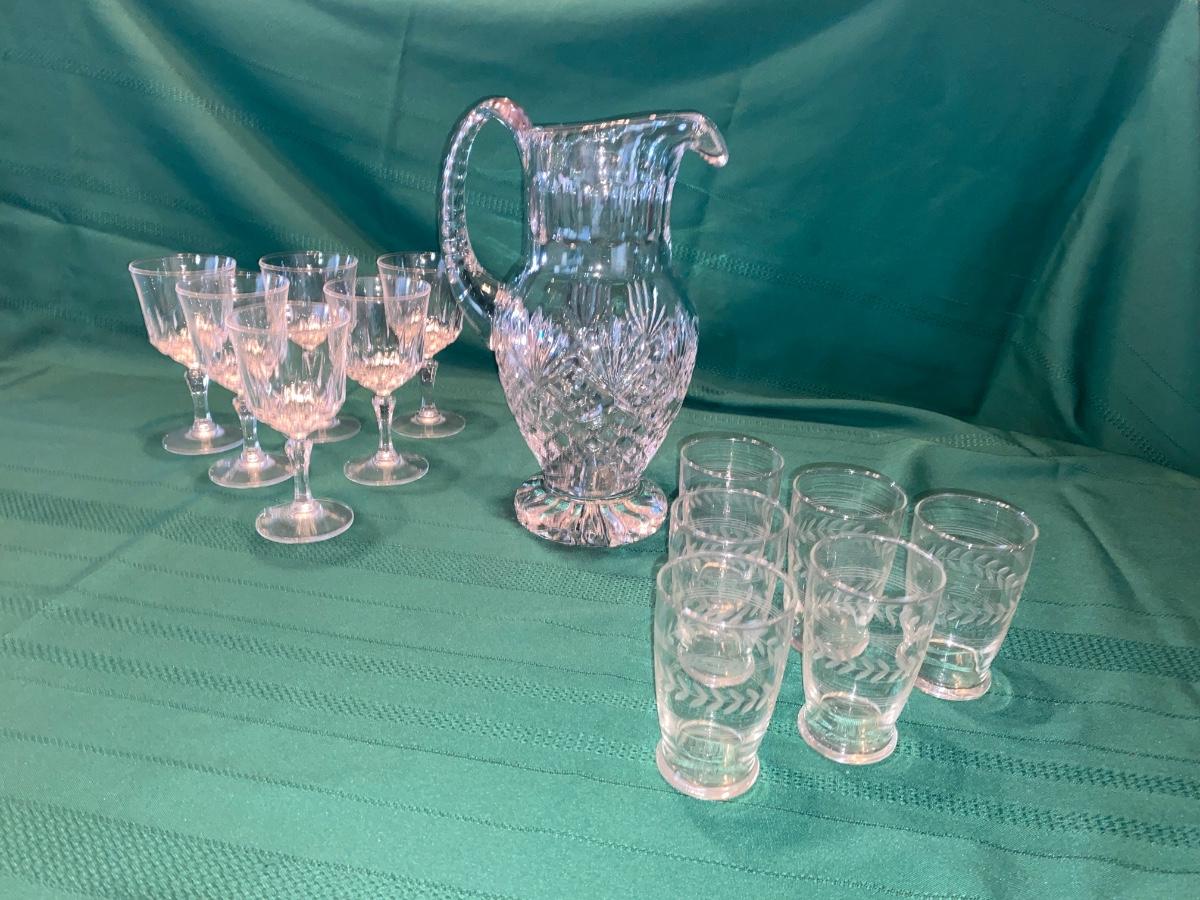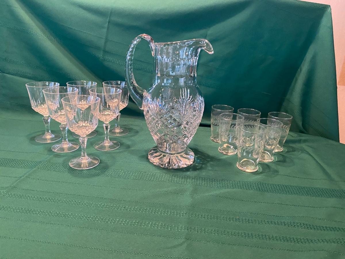 BEAUTIFUL LEAD CRYSTAL PITCHER, WINE GLASSES AND ETCHED JUICE GLASSES