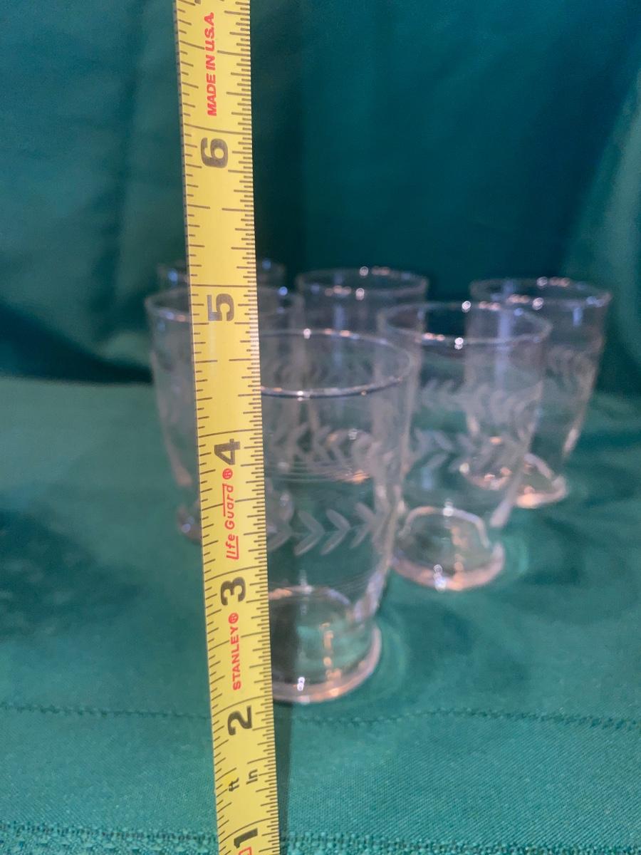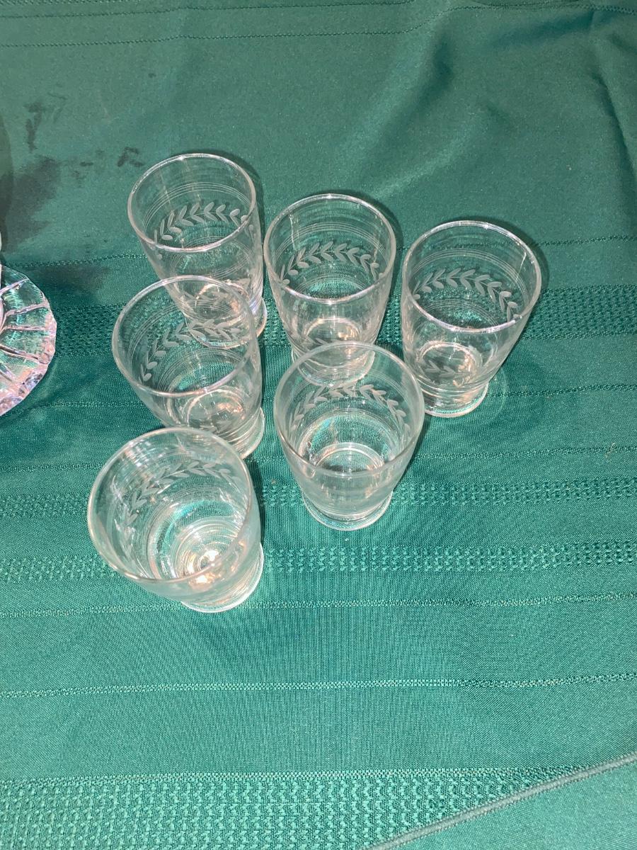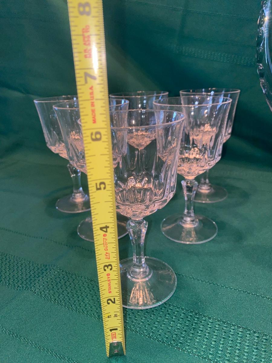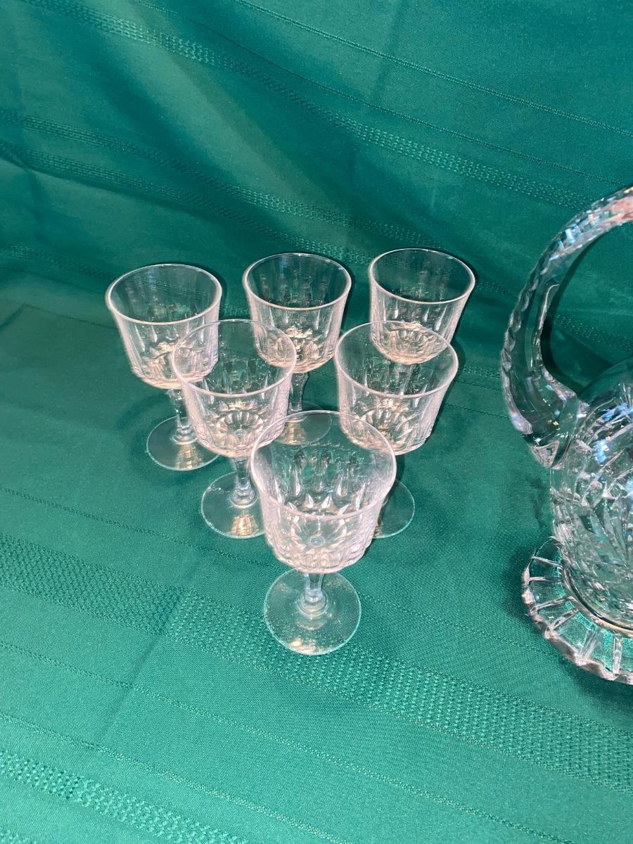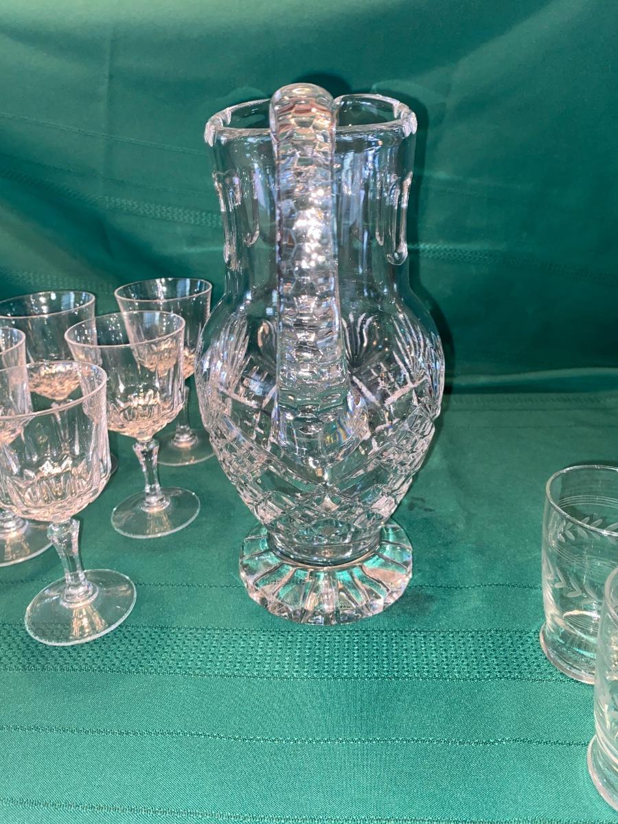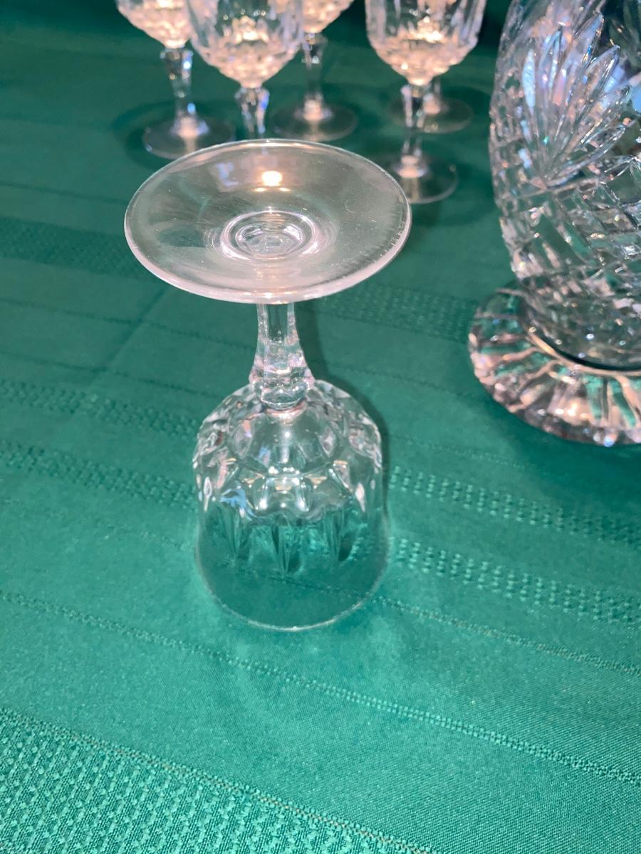 BEAUTIFUL LEAD CRYSTAL PITCHER, WINE GLASSES AND ETCHED JUICE GLASSES