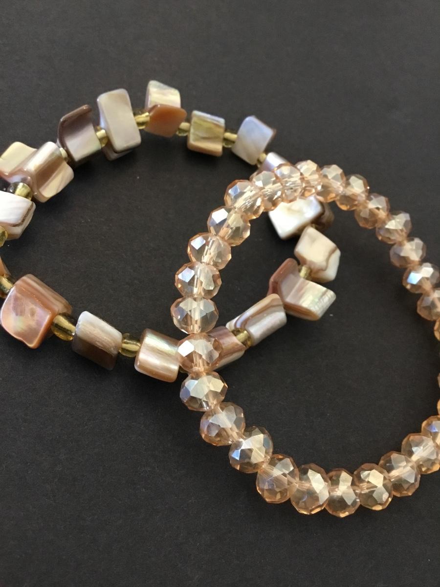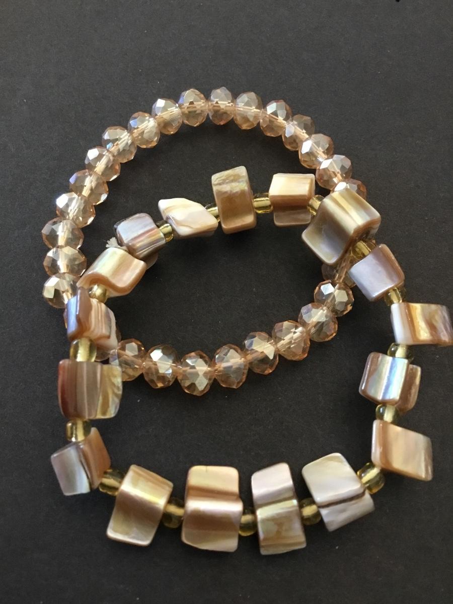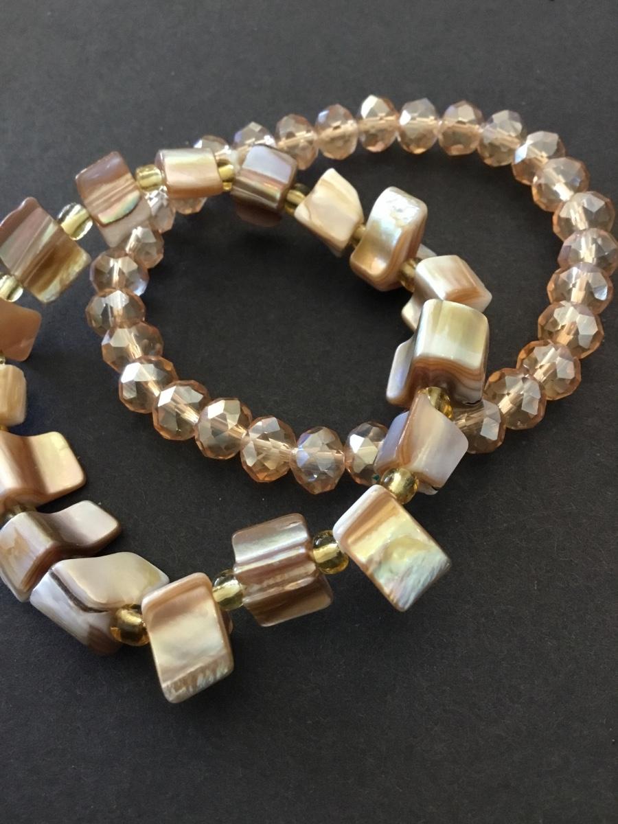 Beautiful light tan natural faceted glass or crystal and shell stretch bracelets