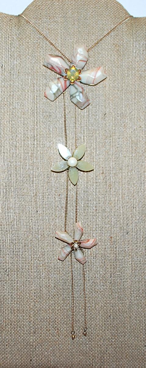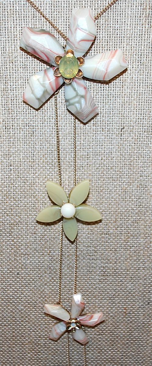 Beautiful MARBLE-Style CARVED FLOWERS NECKLACE With 3 Bejeweled Petal Flowers on a Gold Tone Chain and Lobster Clasp 36" L