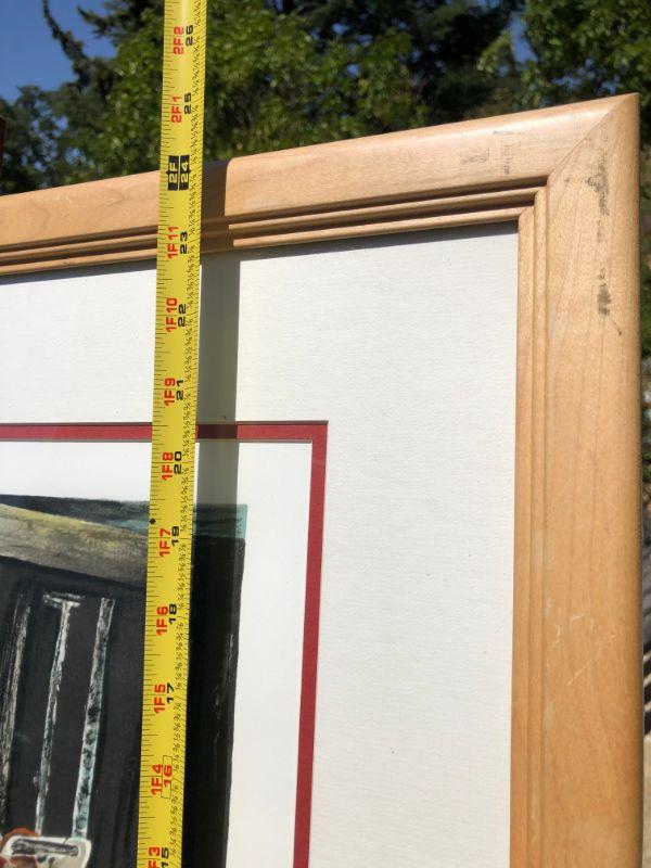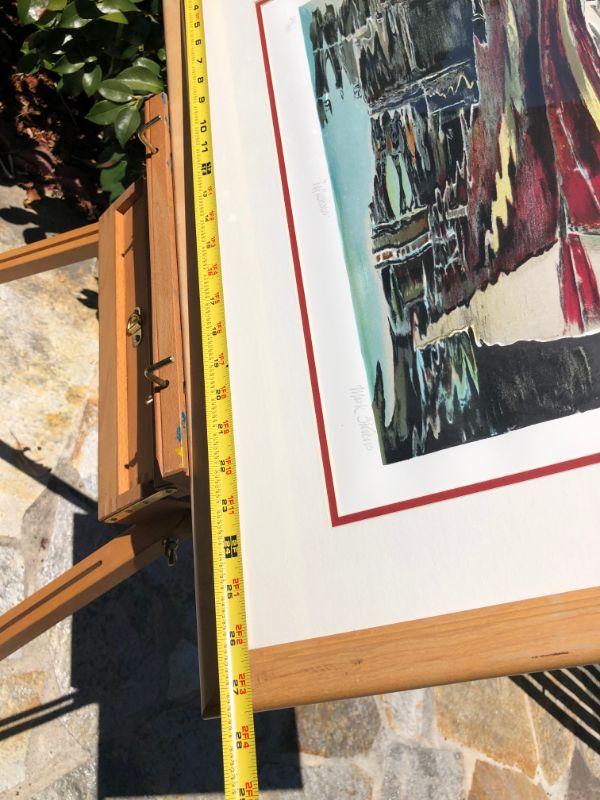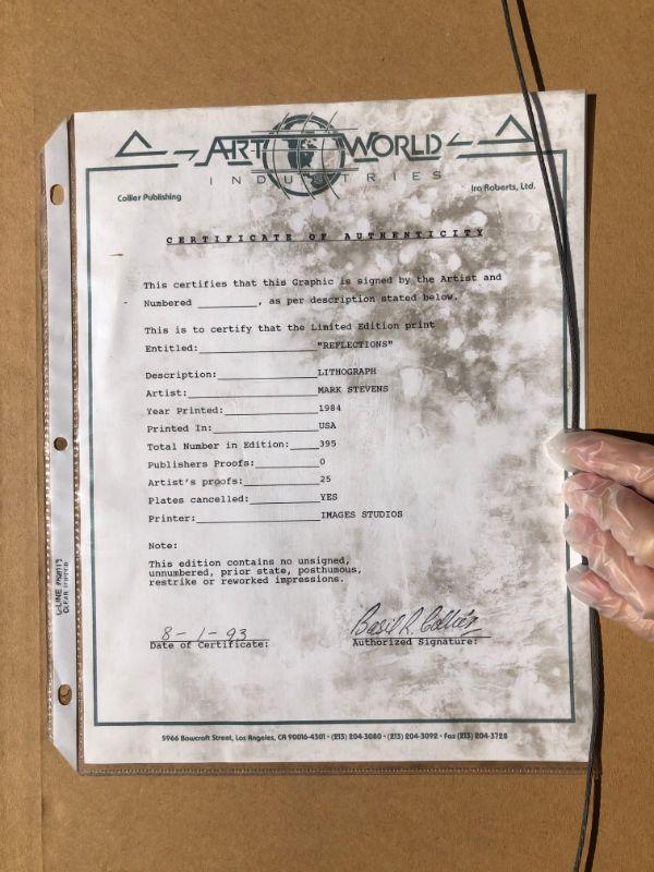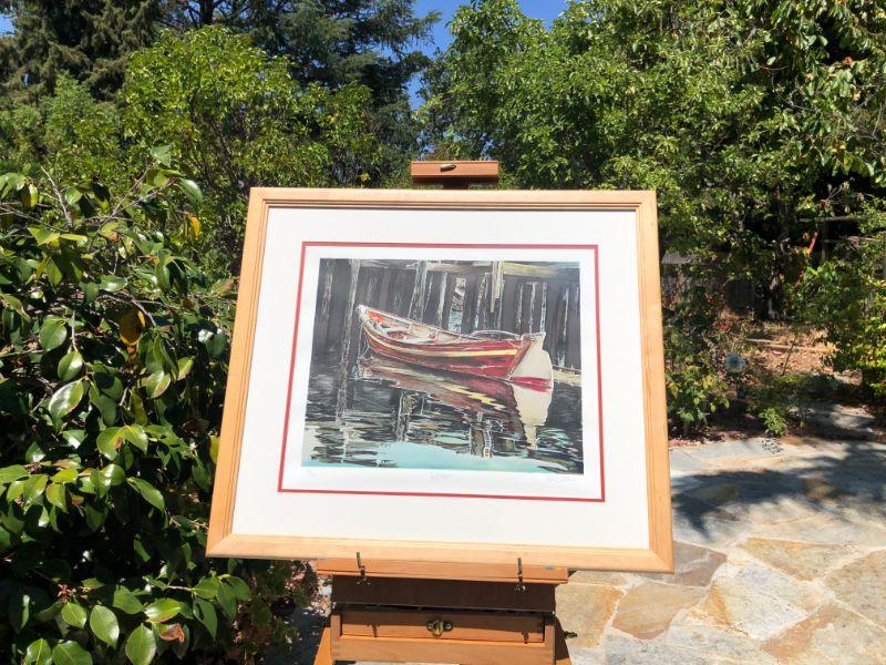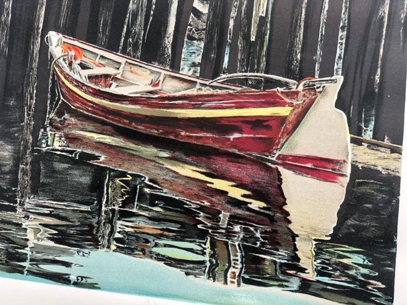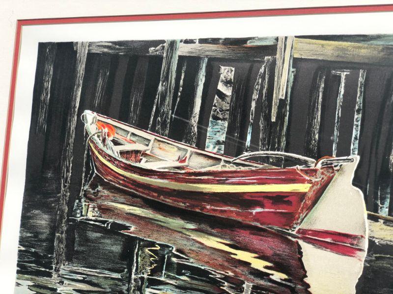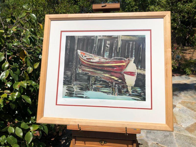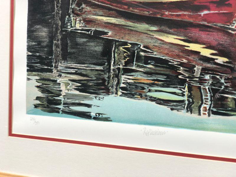 A beautiful and quality lithograph of Mark Stevens "Reflections" painting. Scene shows a boat sitting in calm water, with subtle ripples across the surface. Quality framing. In very good condition.