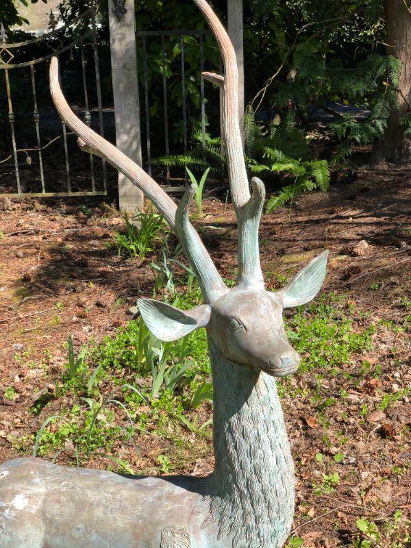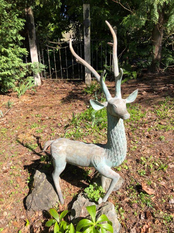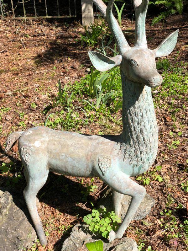 Beautiful metal buck deer yard statue, approximately 52 inches tall. In very good condition. Solid Construction.