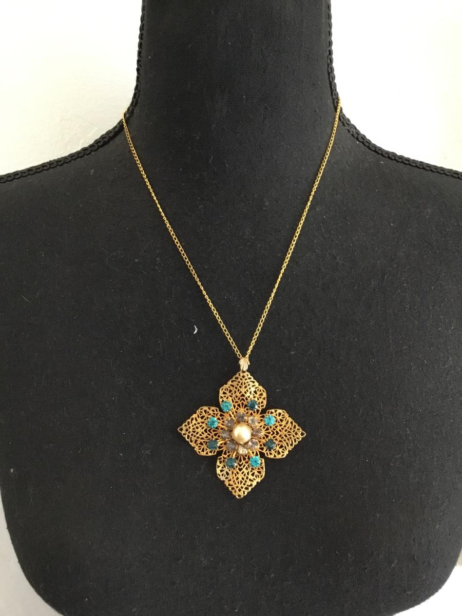 Beautiful, mid century, dark and light, blue rhinestone, flower, gold filigree, pendant necklace