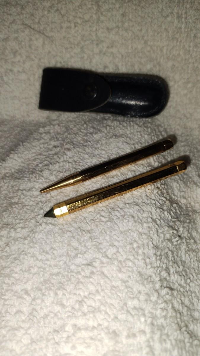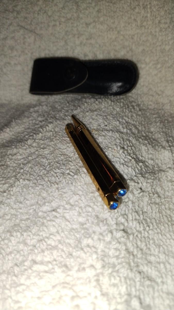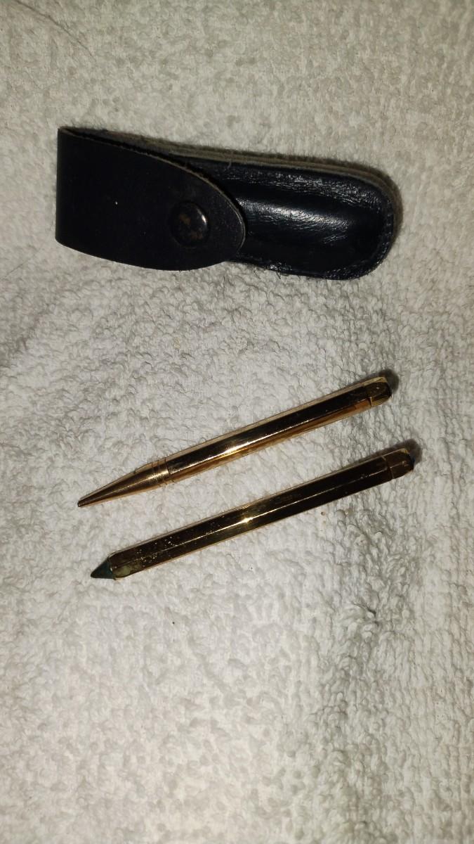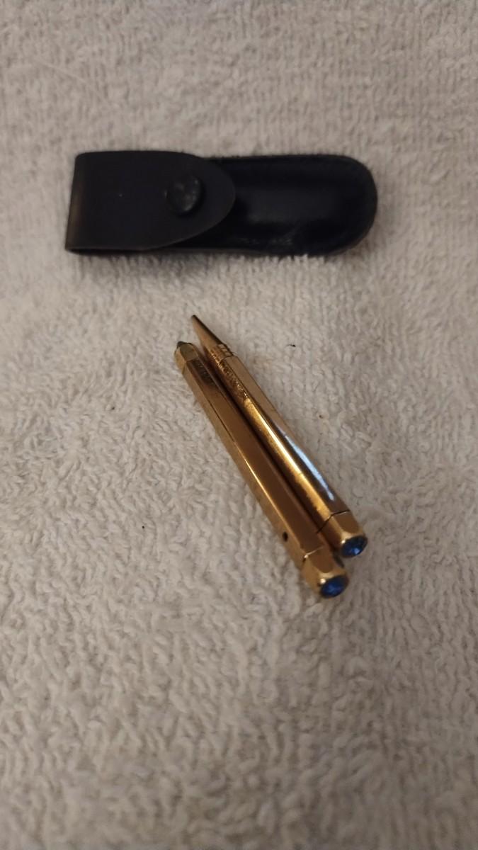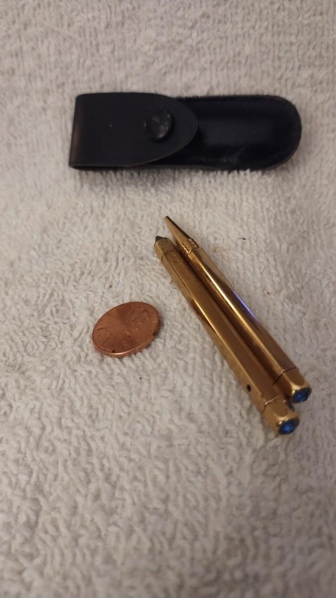 Comes with its own miniature leather case. No markings I could find. Blue Jewels in the end of both. Pen is ballpoint. Pencil has lead in it already. Good condition