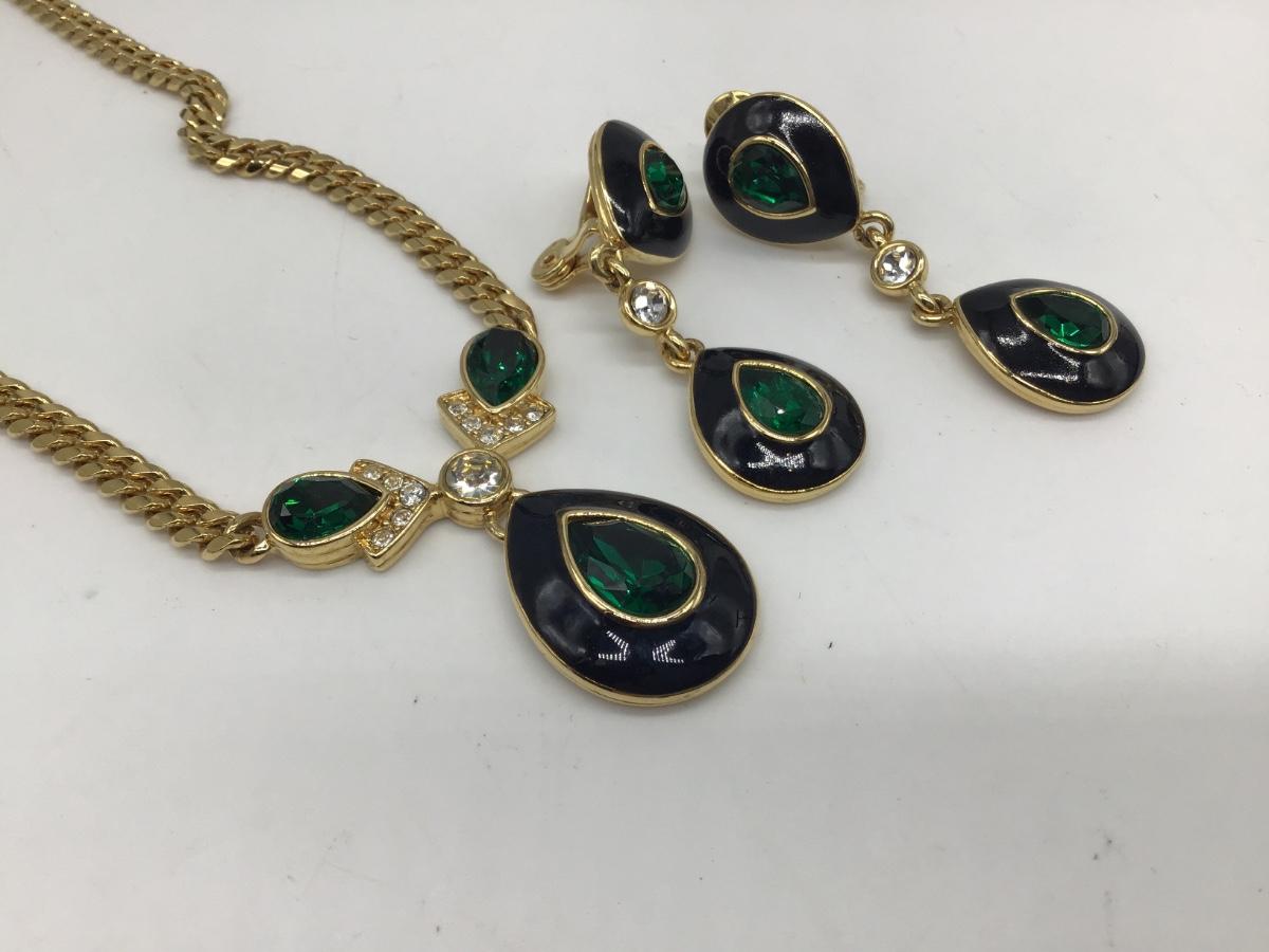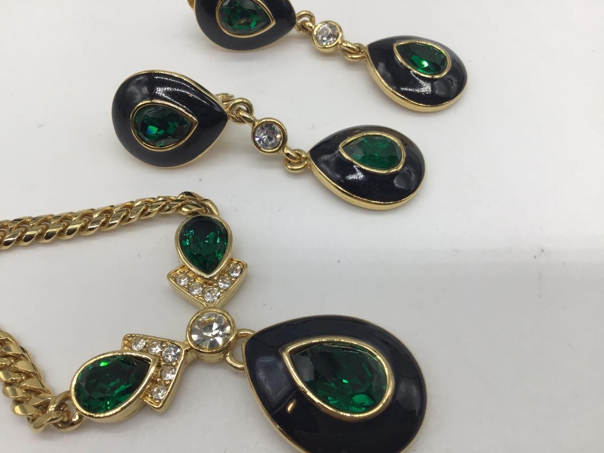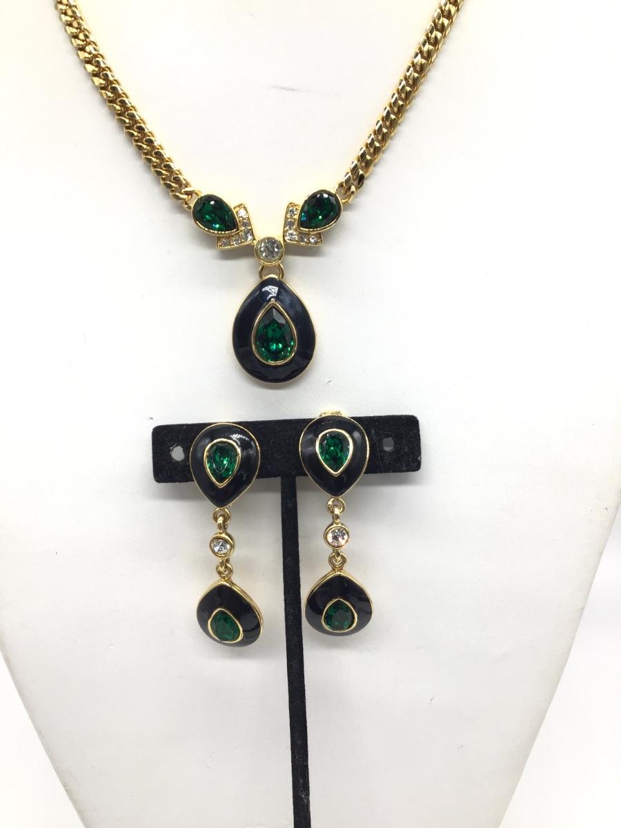 Beautiful Monet Enamel and Green Glass Pendant necklace and Earring Set