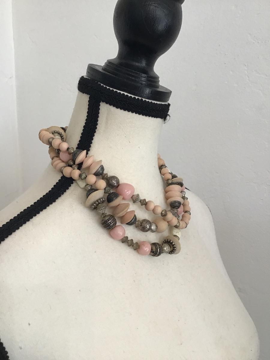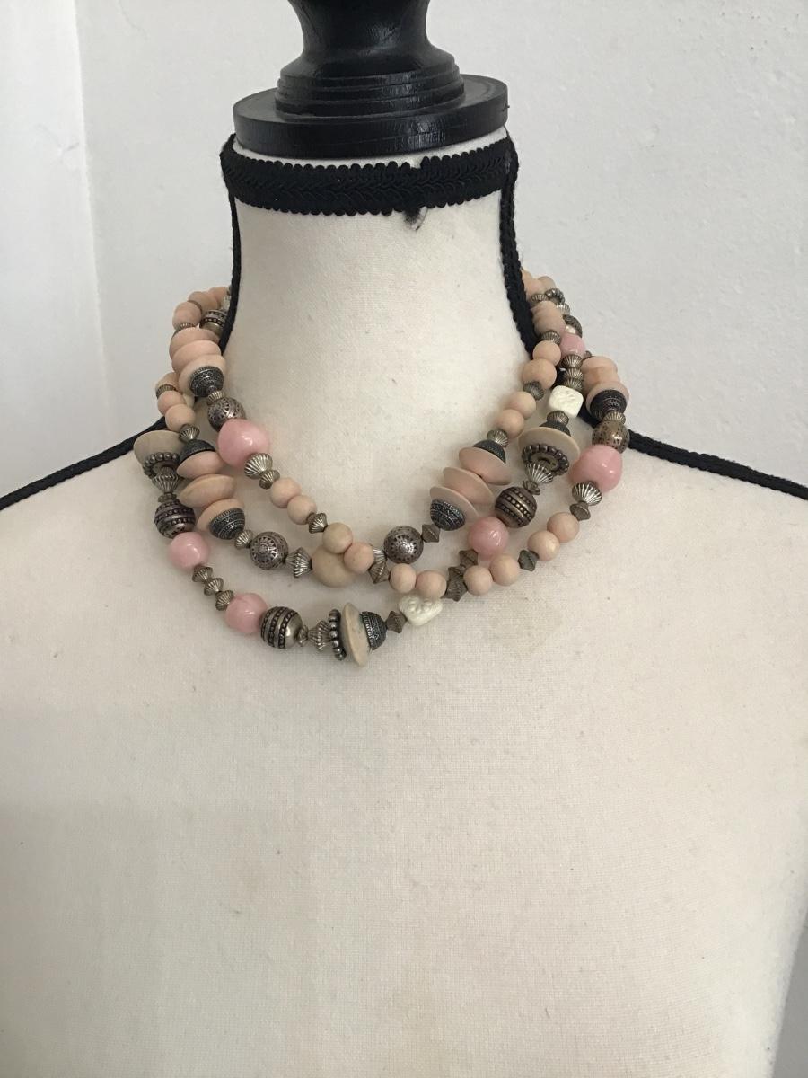 Beautiful, multi strand beaded necklace with pink and cream and silver tone beads