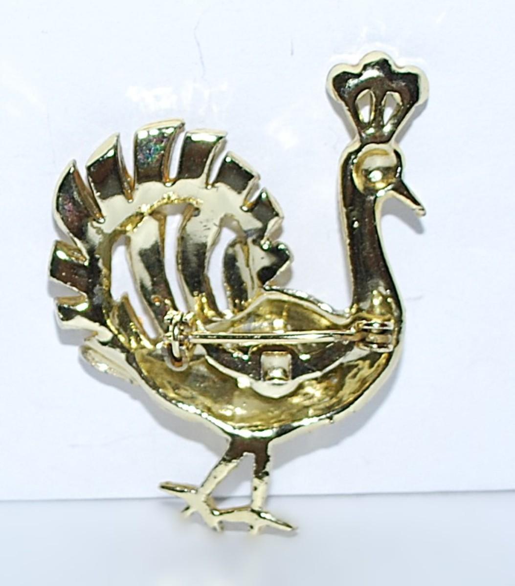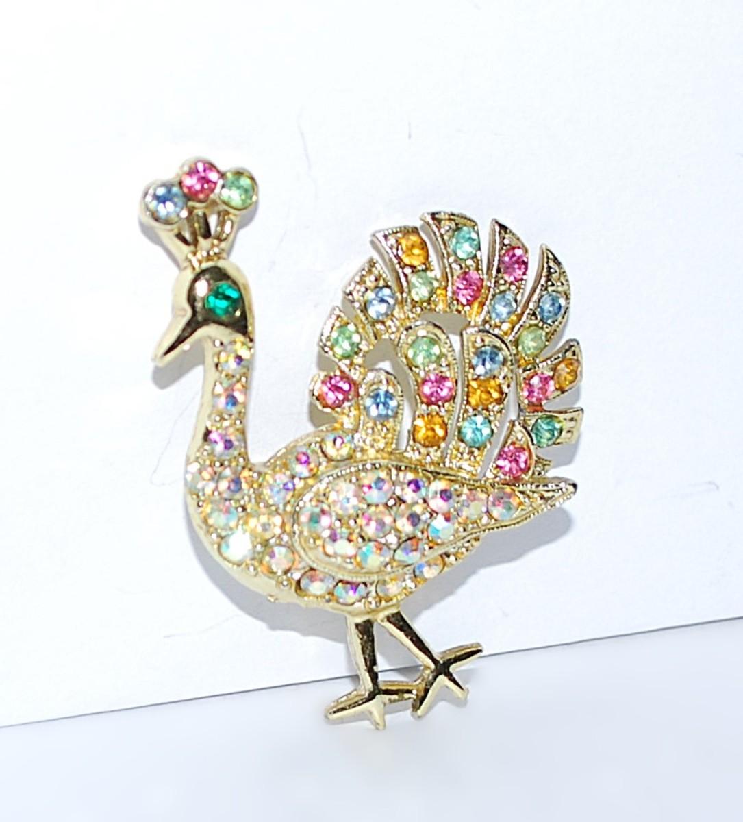 Beautiful Multi-Color PEACOCK BROOCH (1¾" x 1¼") with Pink, Green, Blue & Amber Colored Feathers on a Gold Tone Setting