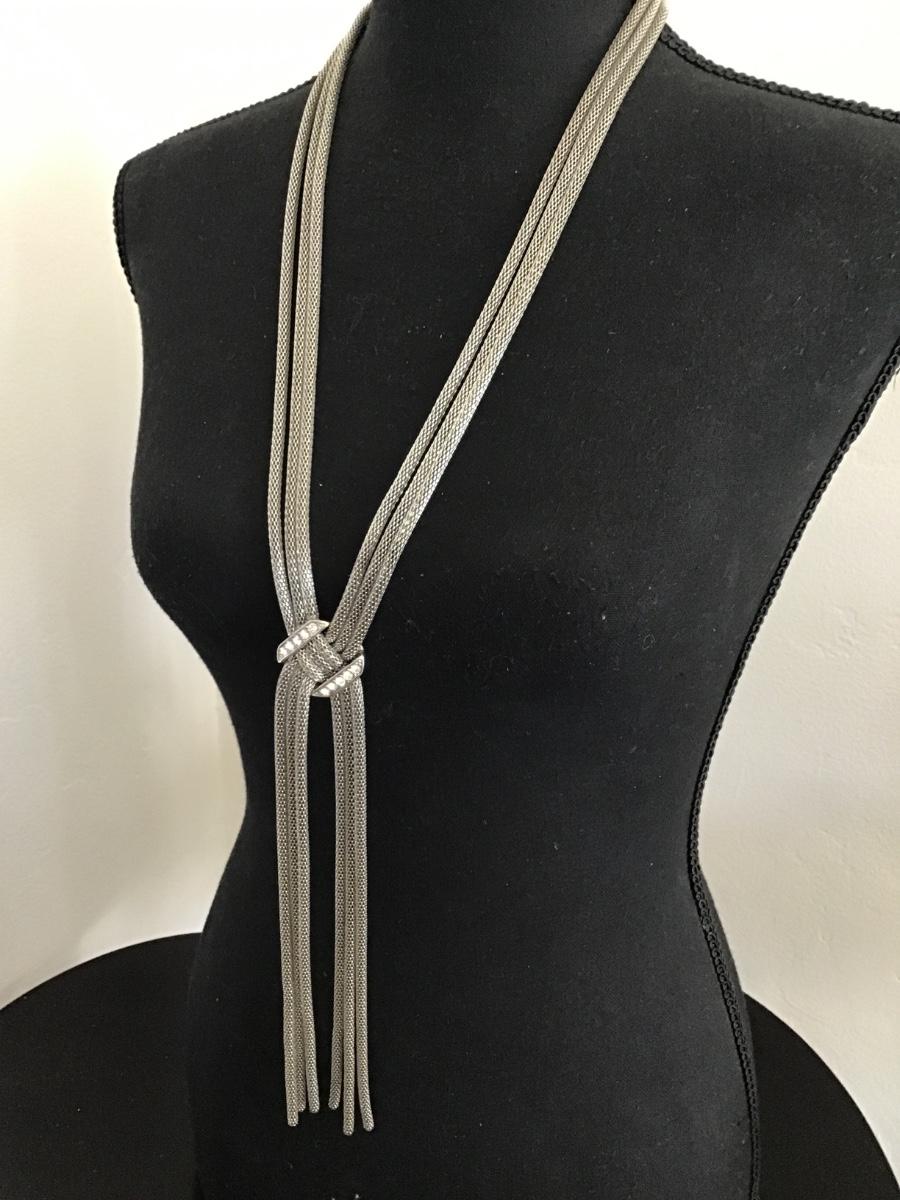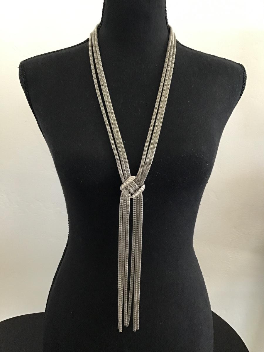 Beautiful multistrand, Silvertone snake chain, tassel necklace, knot design