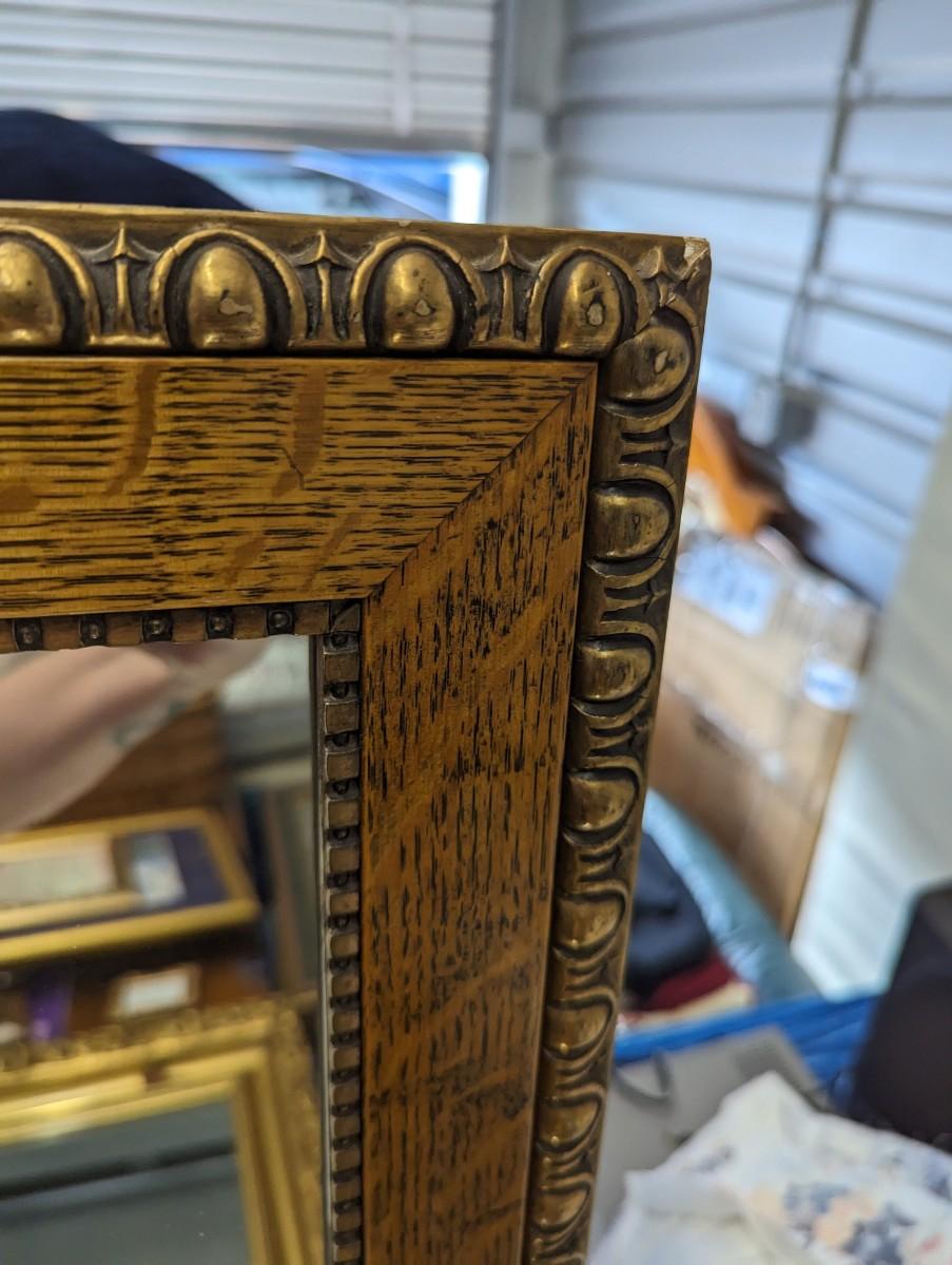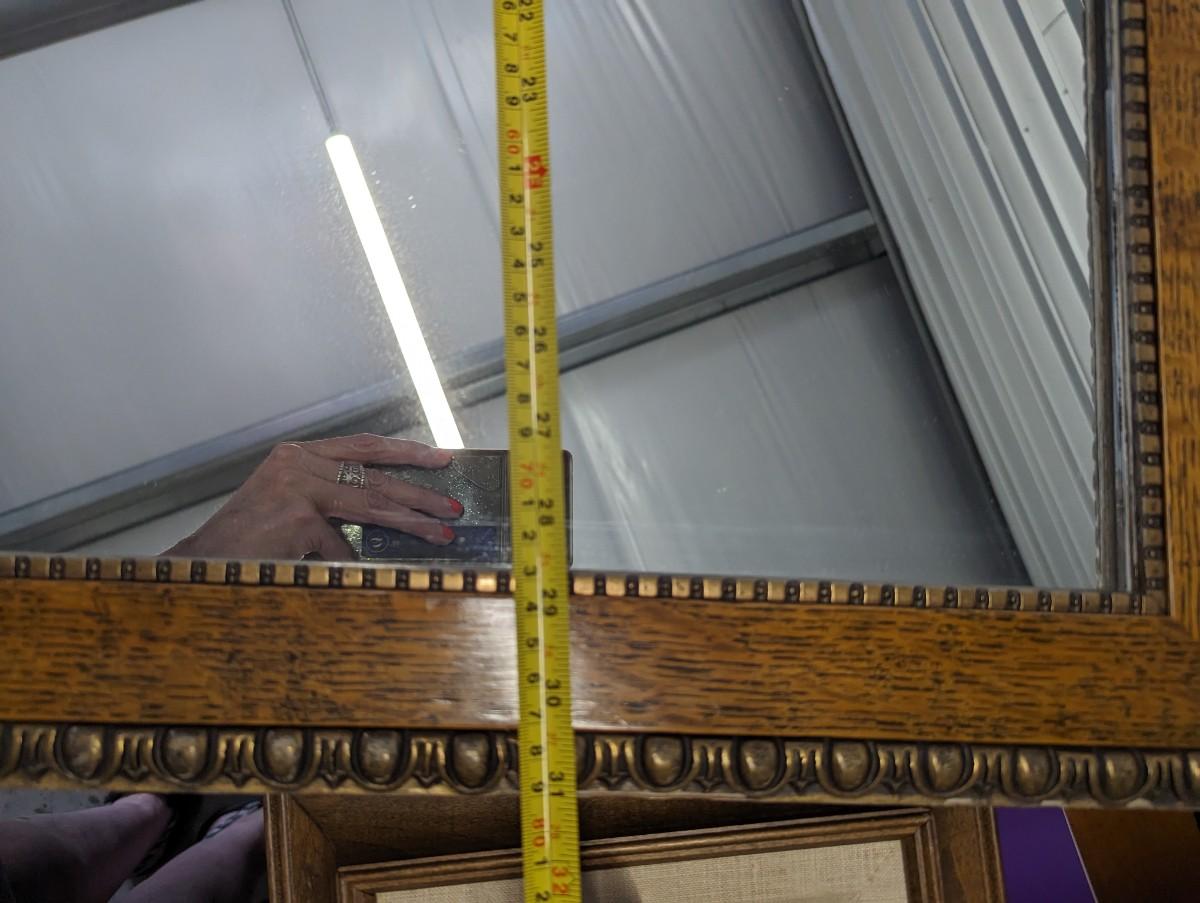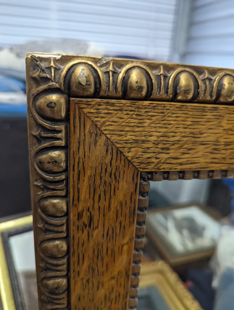 Beautiful oak framed mirror with brass like material around the rectangle mirror.