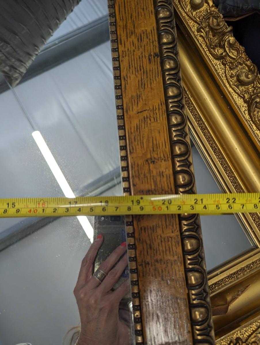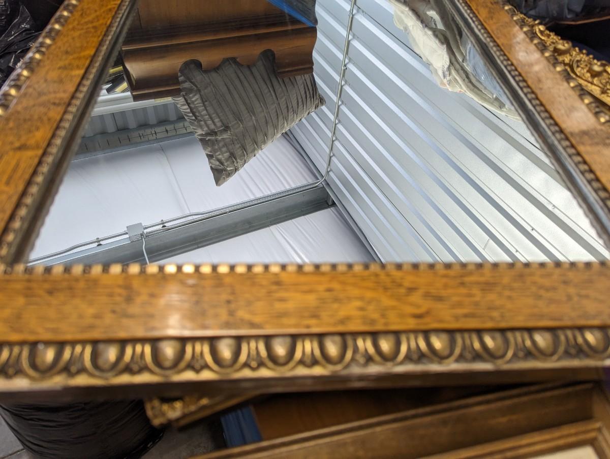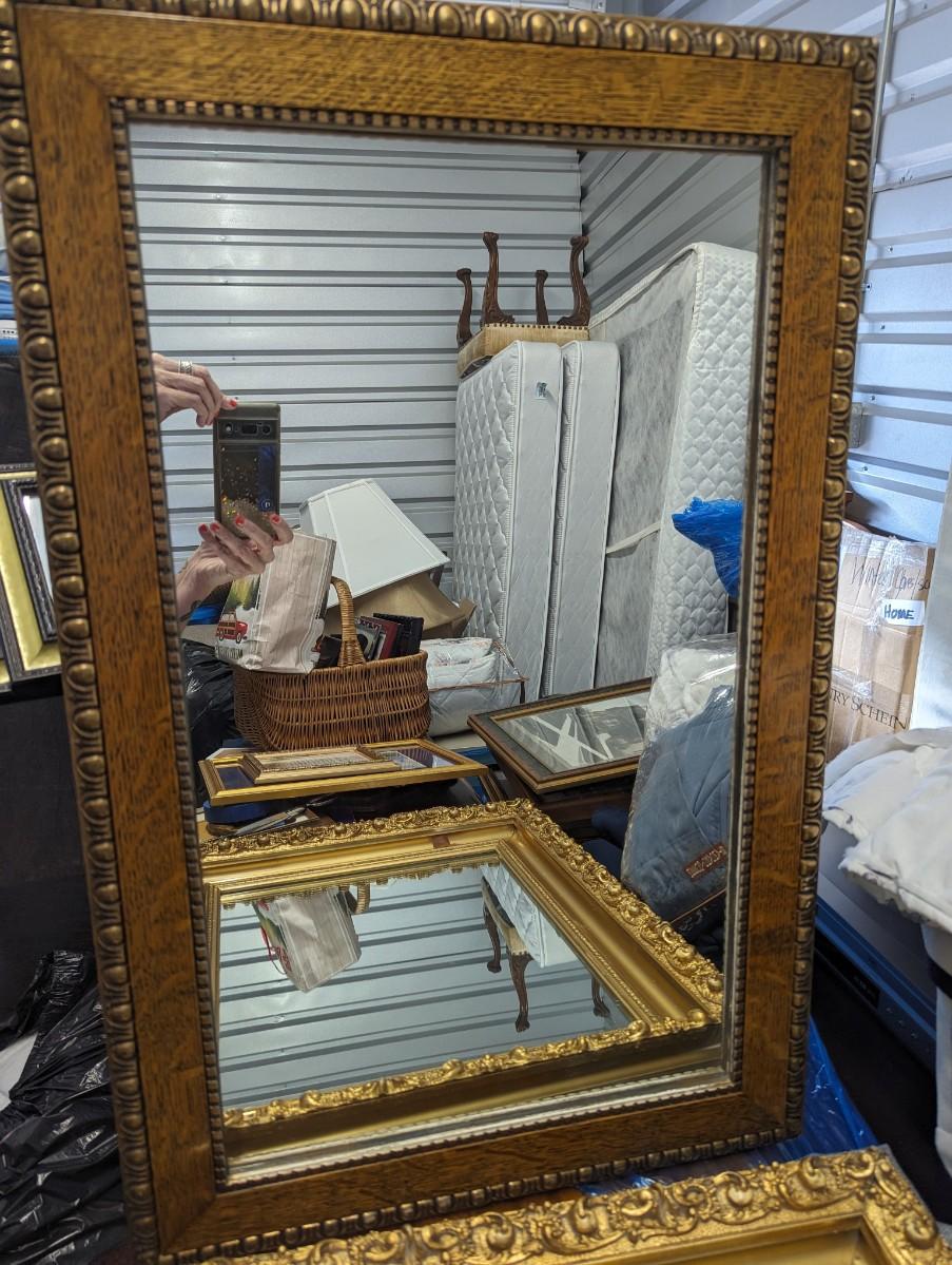 Beautiful oak framed mirror with brass like material around the rectangle mirror.