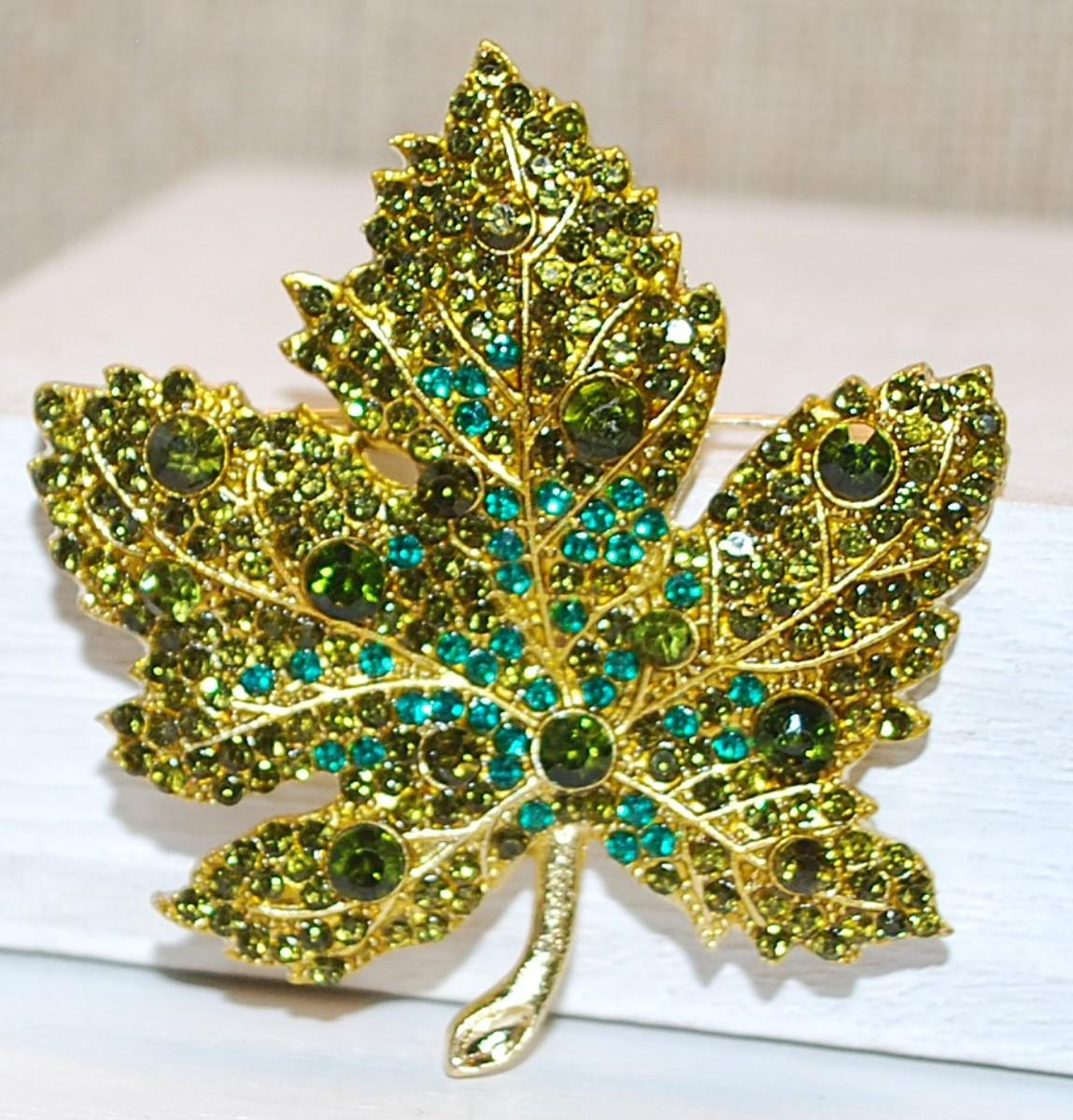 Beautiful Oak Style Leaf BROOCH (2" x 1¾") with Deep GREEN & AQUAMARINE Stones on a Gold Tone Setting