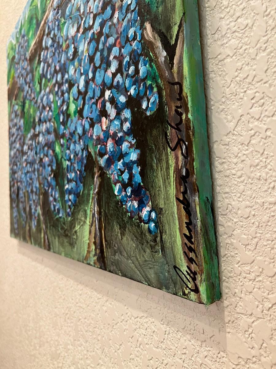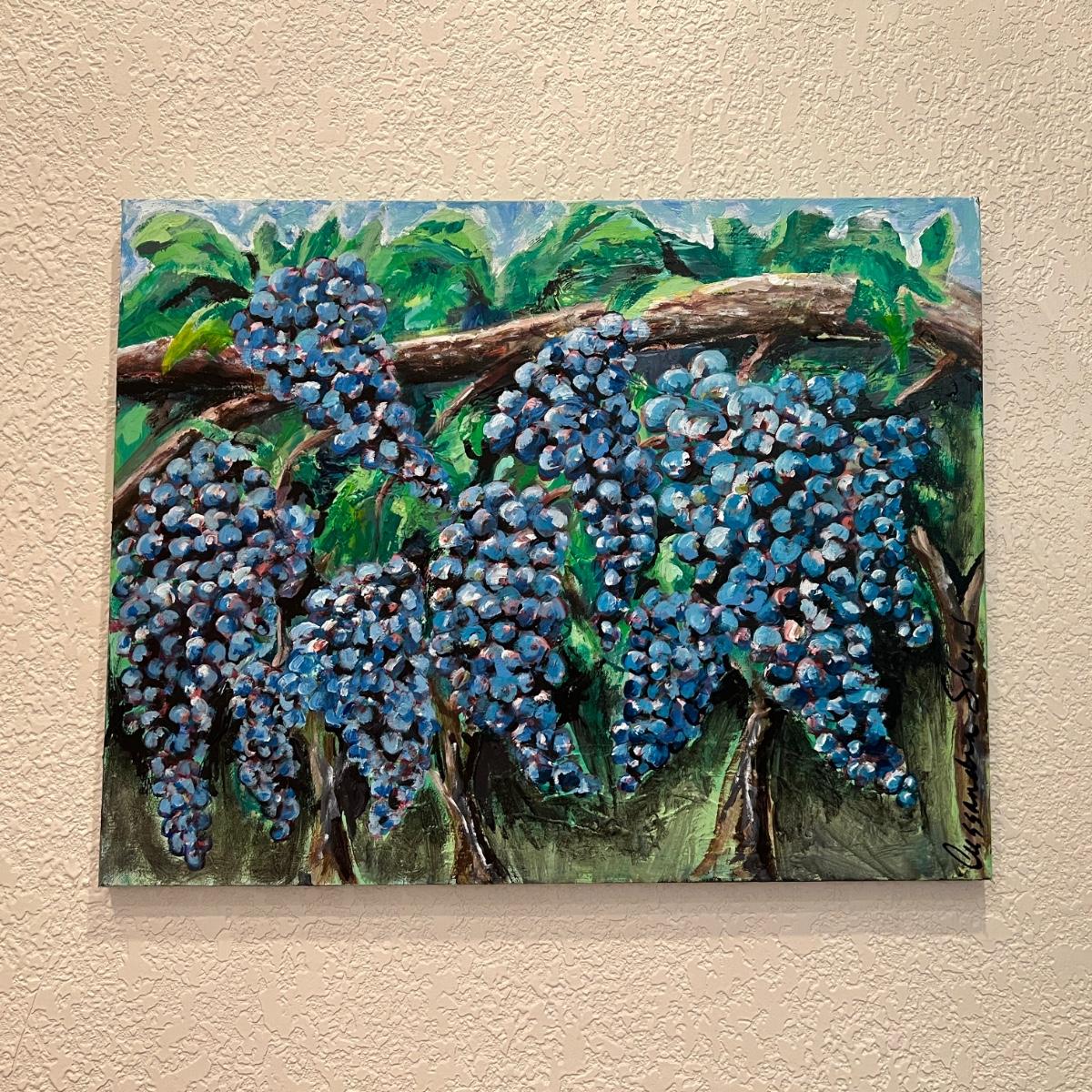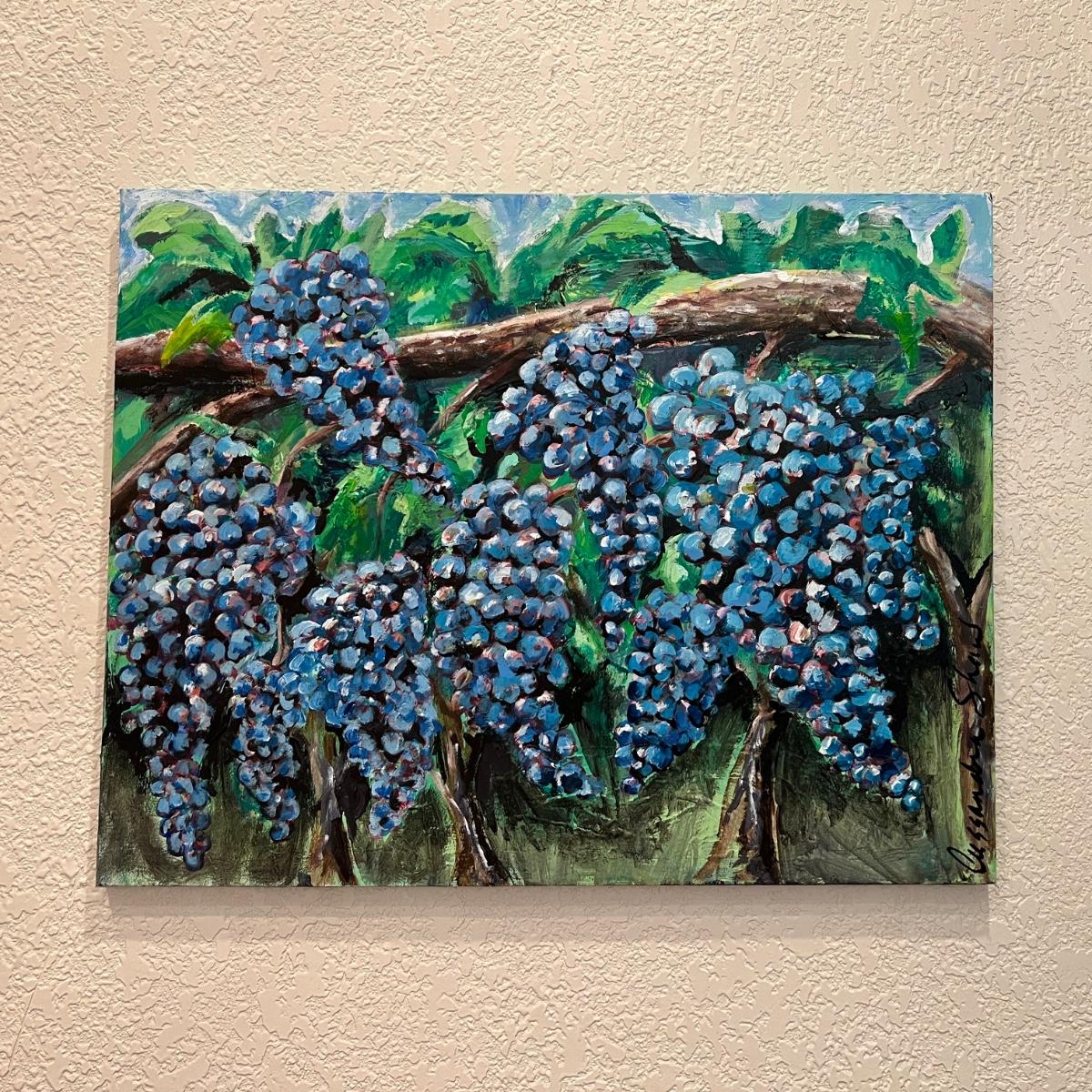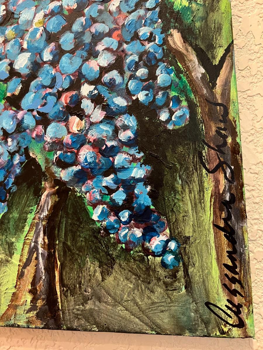 Beautiful Original Painting on stretched canvas of Lush Purple Grapes on the Vine Signed Cassandra Shaw. In good condition, as shown.