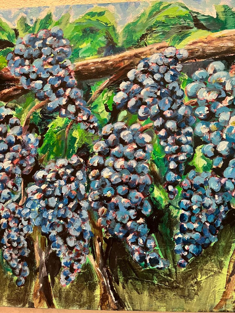 Beautiful Original Painting of Lush Purple Grapes on the Vine Signed Cassandra Shaw