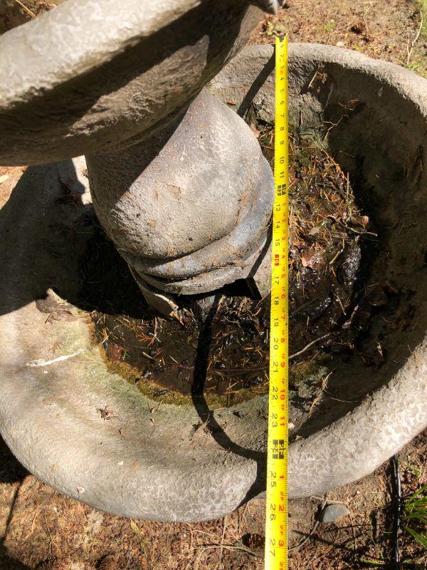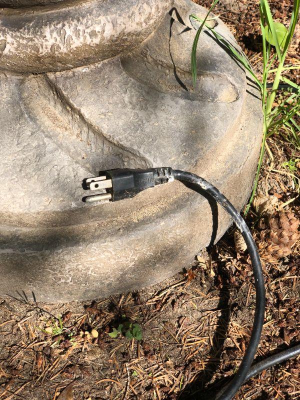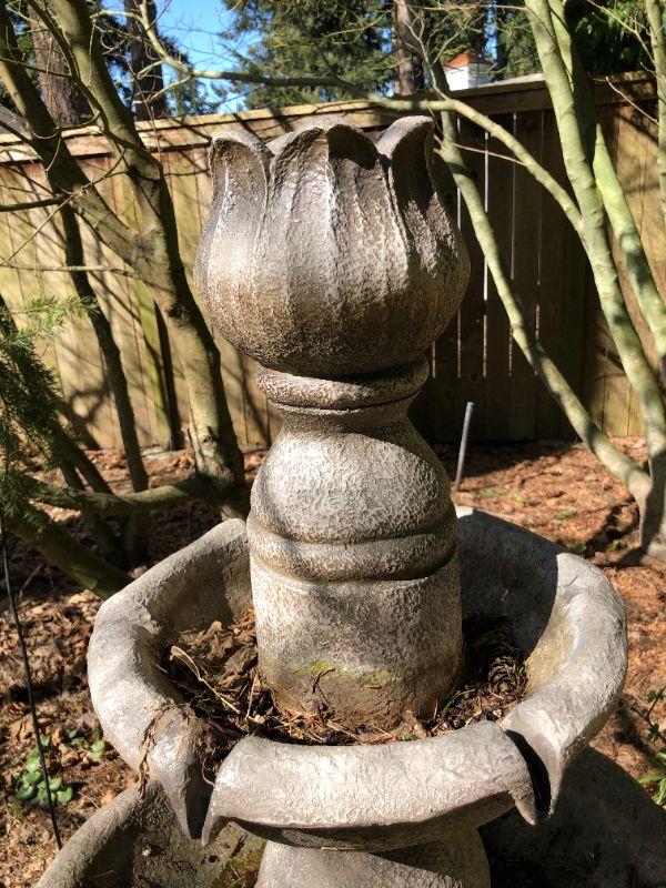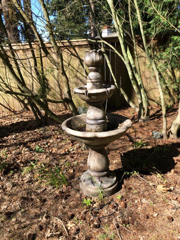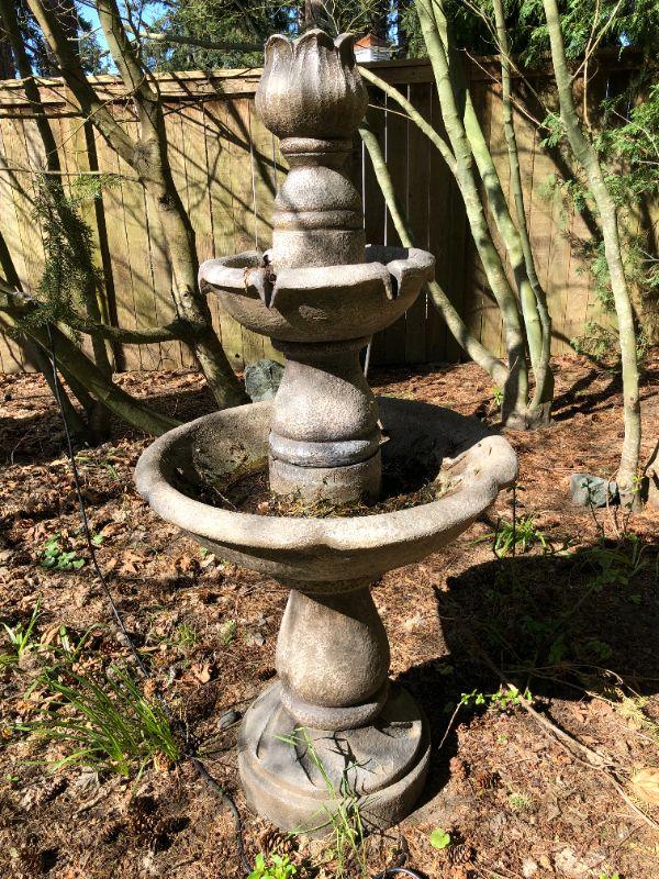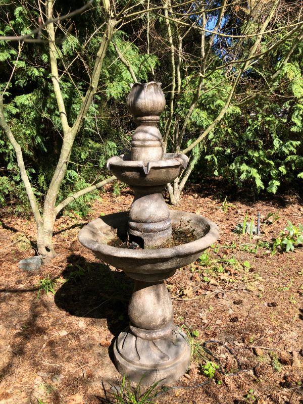 Beautiful outdoor garden fountain with two tiers. Approximately 57 inches tall. Has a plug-in motor (to our knowledge it is in working condition, but we did not test it). In very good condition, just needs to be cleaned.