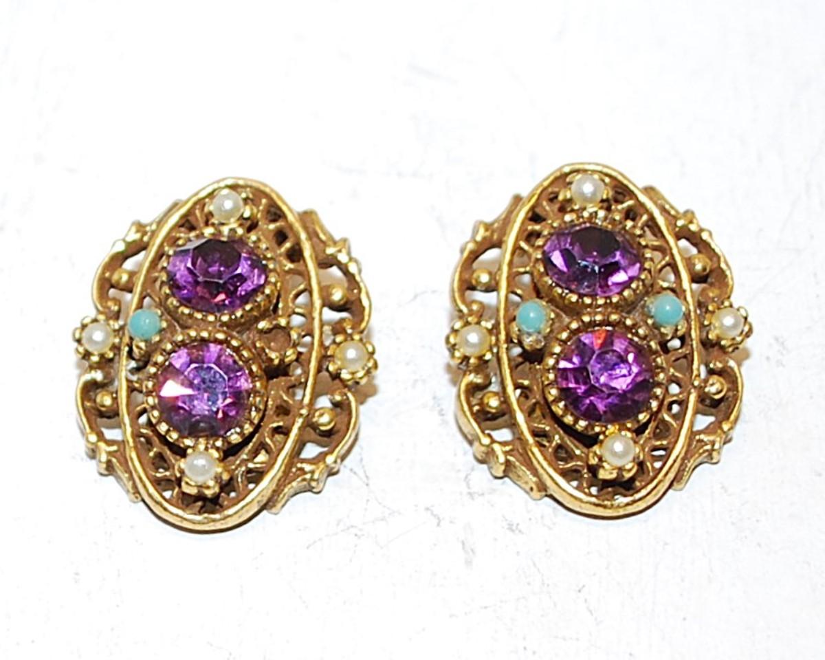 Beautiful Oval EARRINGS (1" Circ.) with Bright Purple Round Stones & Aquamarine/White Globe Beads with a Snap Style Clasp