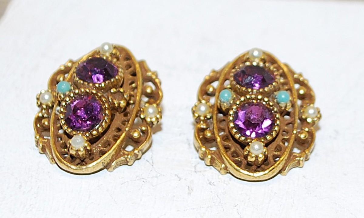Beautiful Oval EARRINGS (1" Circ.) with Bright Purple Round Stones & Aquamarine/White Globe Beads with a Snap Style Clasp