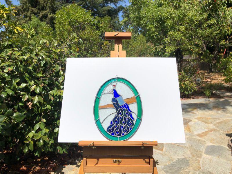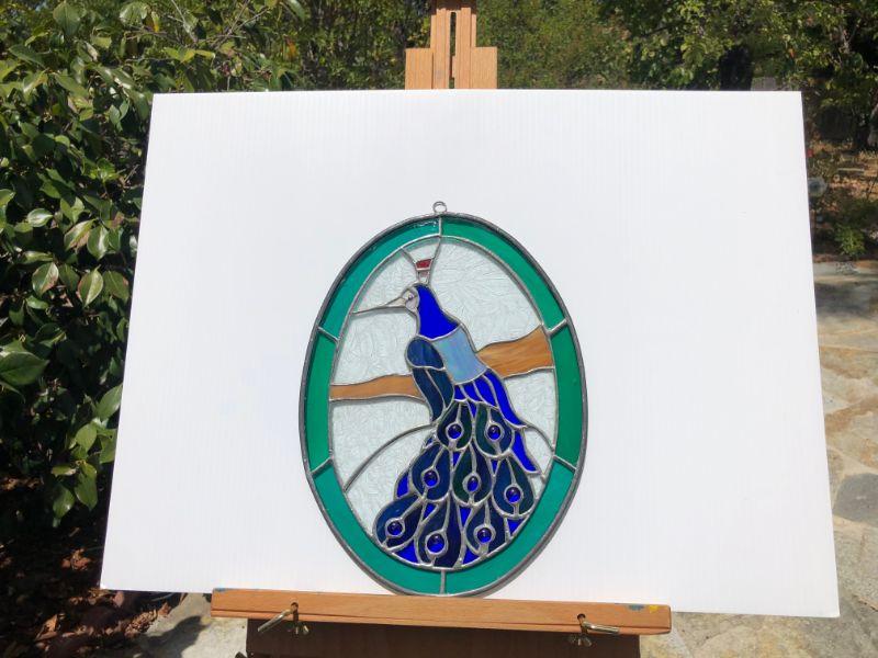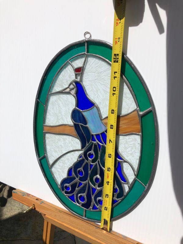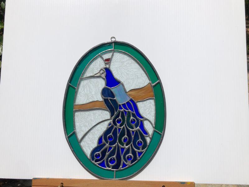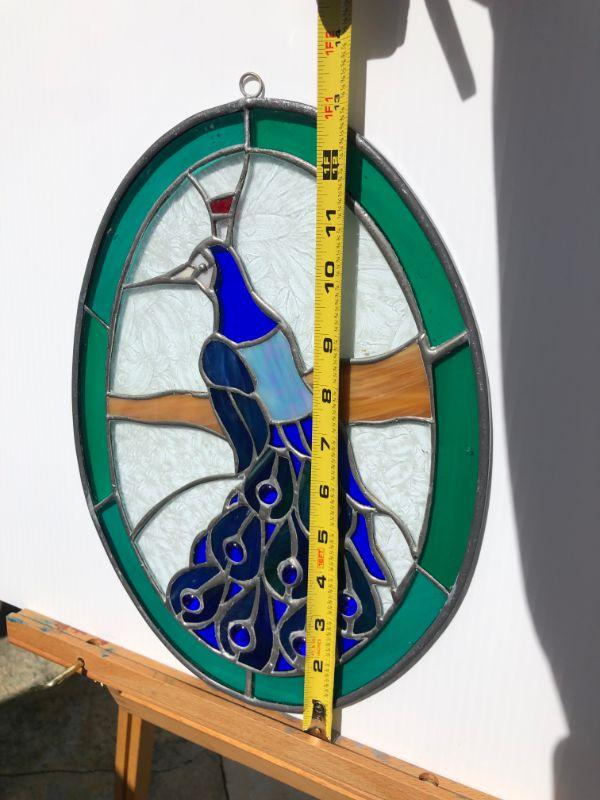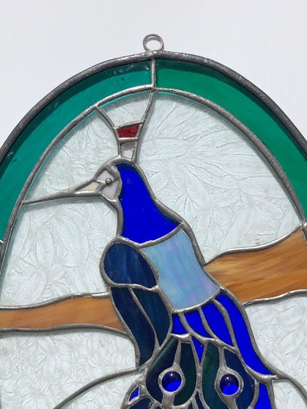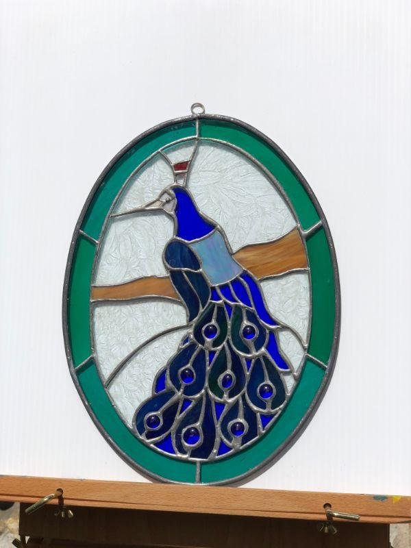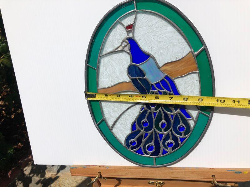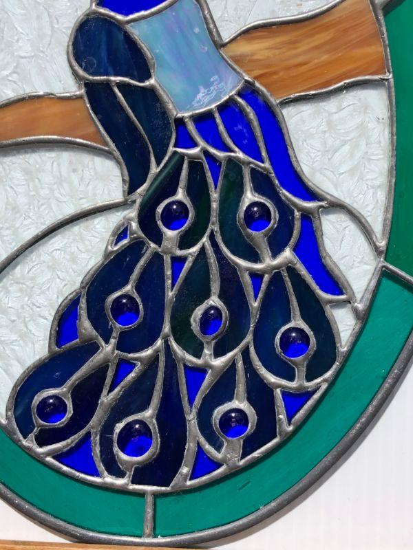 A beautiful peacock stained glass window, featuring vibrant blue and green glass. In very good condition.