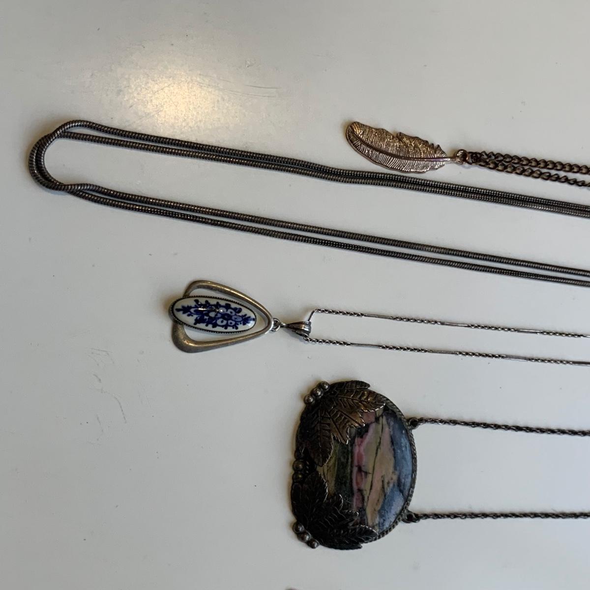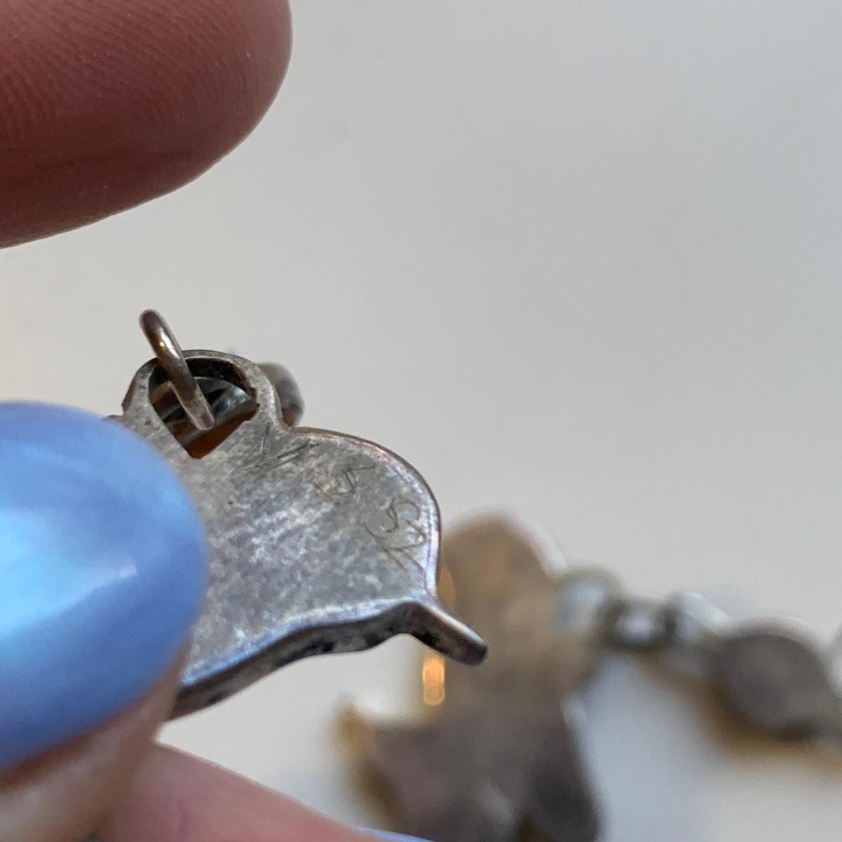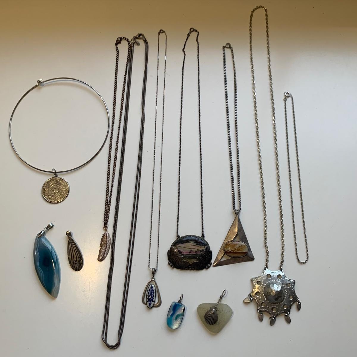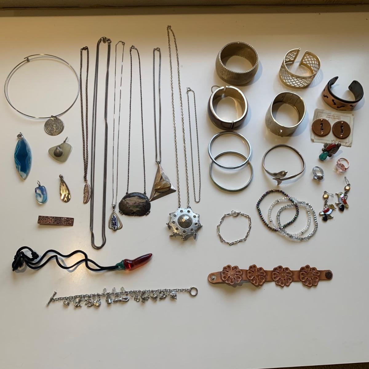 A collection of jewelry including nine necklaces, five loose pendants, 14 bracelets (one with matching clip earrings), three rings, and a pair of bird earrings for pierced ears. The butterfly wing pendant and two stone pendants are marked “˜Sterling’ or “˜925’. The dolphin bracelet is marked “˜KRN Ster’. The longest necklace is the double chain Chico’s necklace at 30” and the shortest is the single chain at 16”. Please see photos for inventory and any markings found.