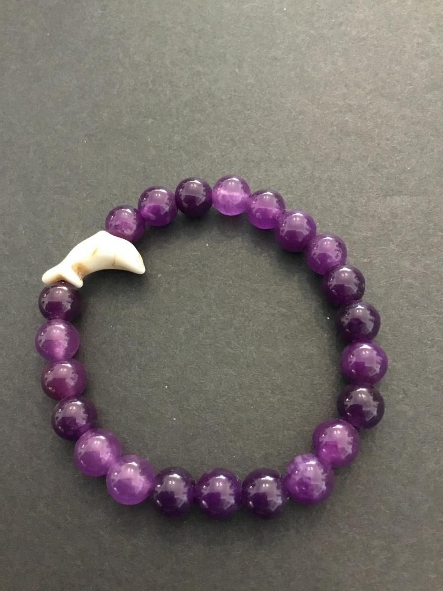 Beautiful, purple, amethyst, beaded stretch bracelet, carved dolphin