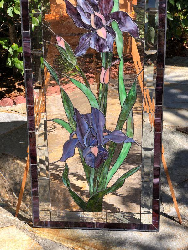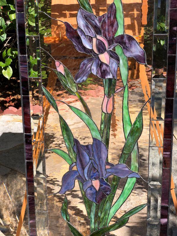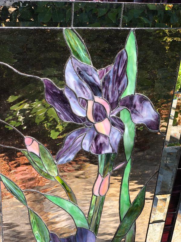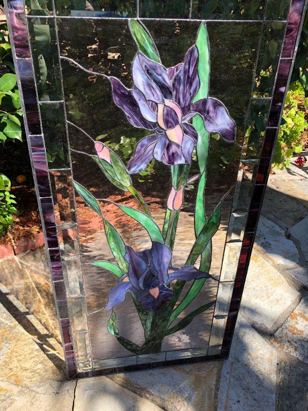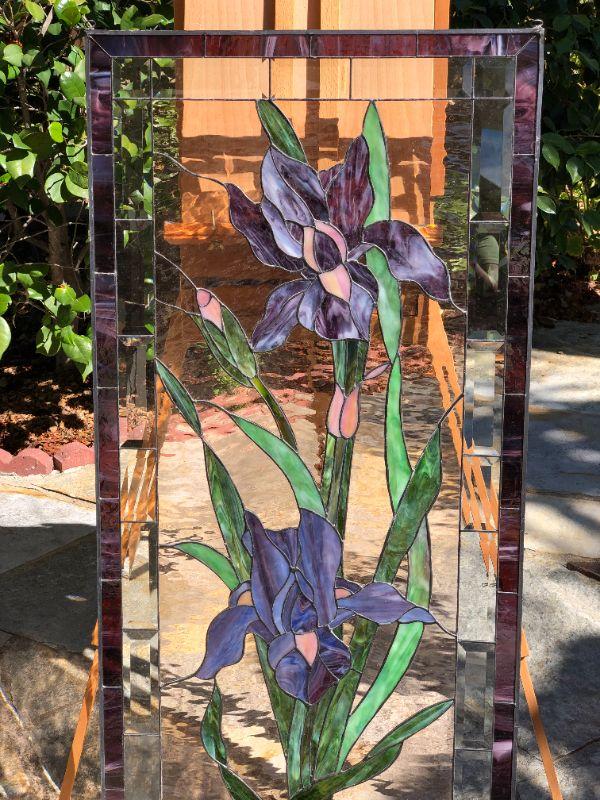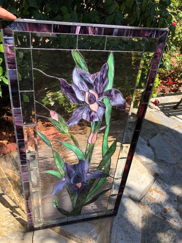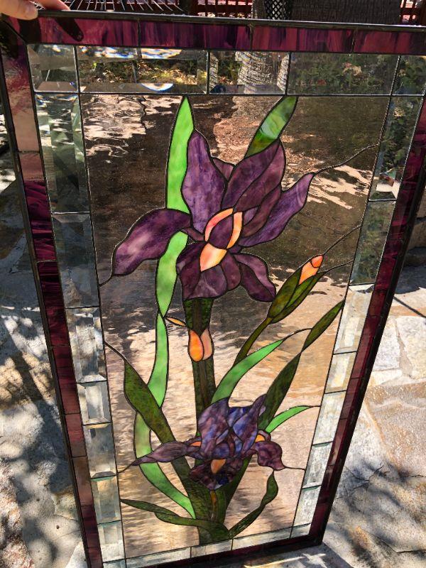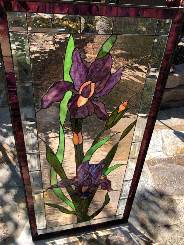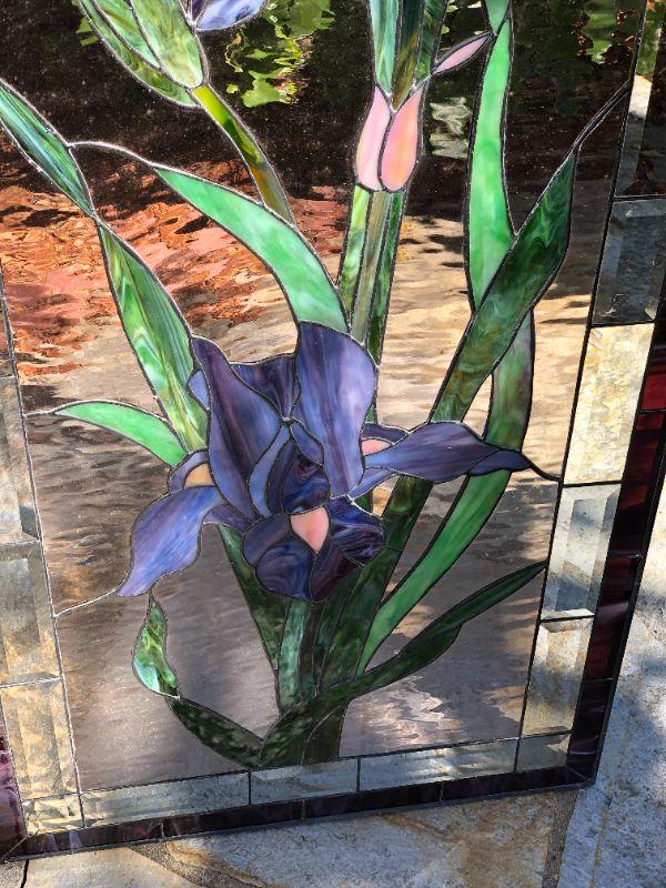 Elegant and beautiful, these vibrant purple iris' would be a wonderful addition to any home! The purple and green colors of the glass are very eye catching. This window has a quality construction and excellent condition (no visible chips or cracks). We included images of the front and back. The dimensions are approximately 47 x 23 inches.