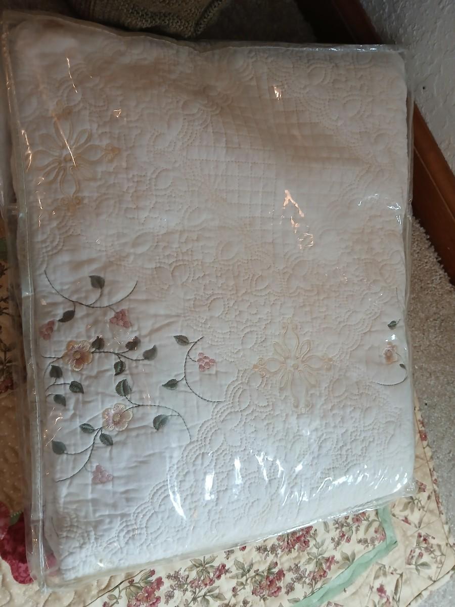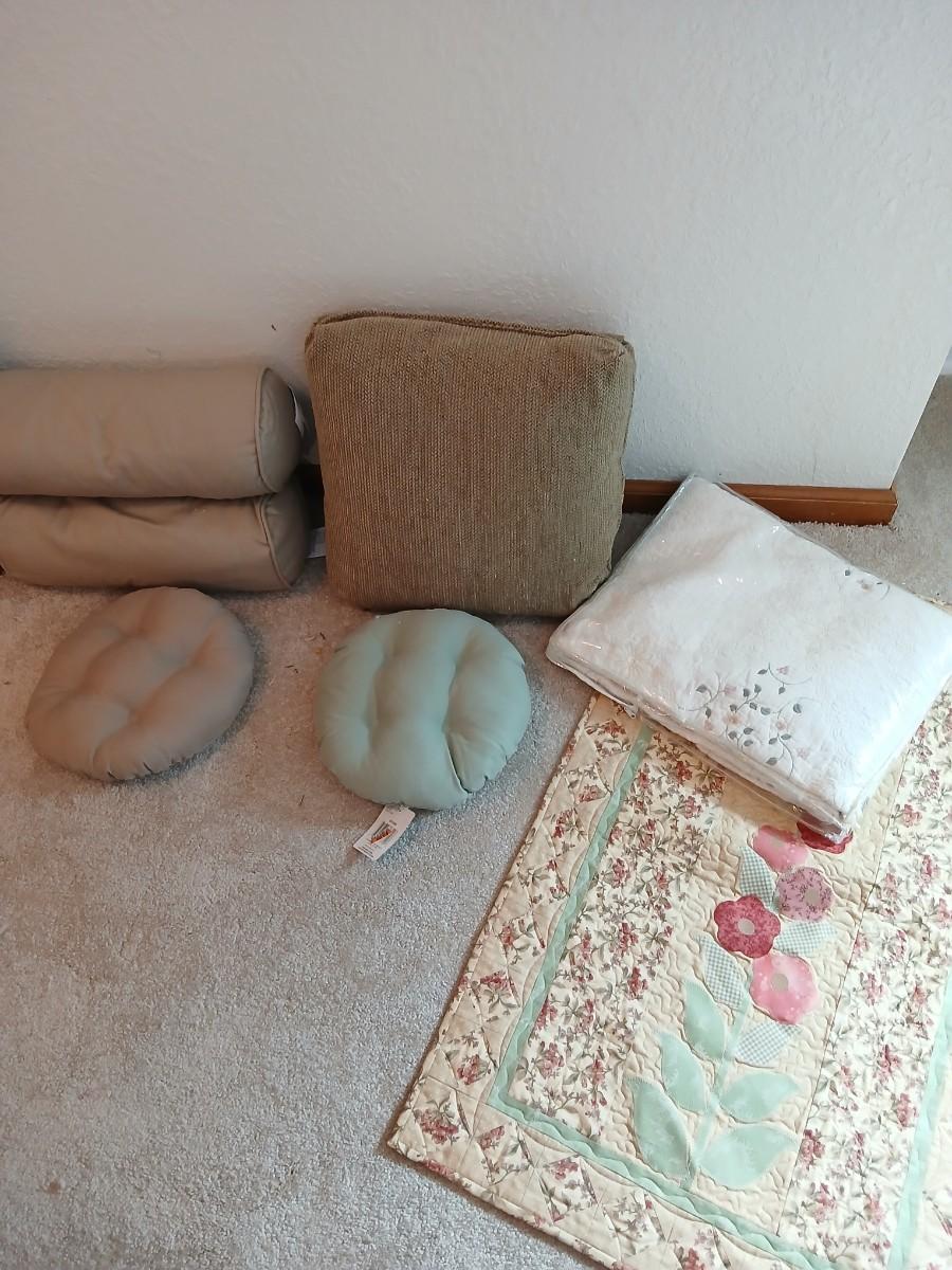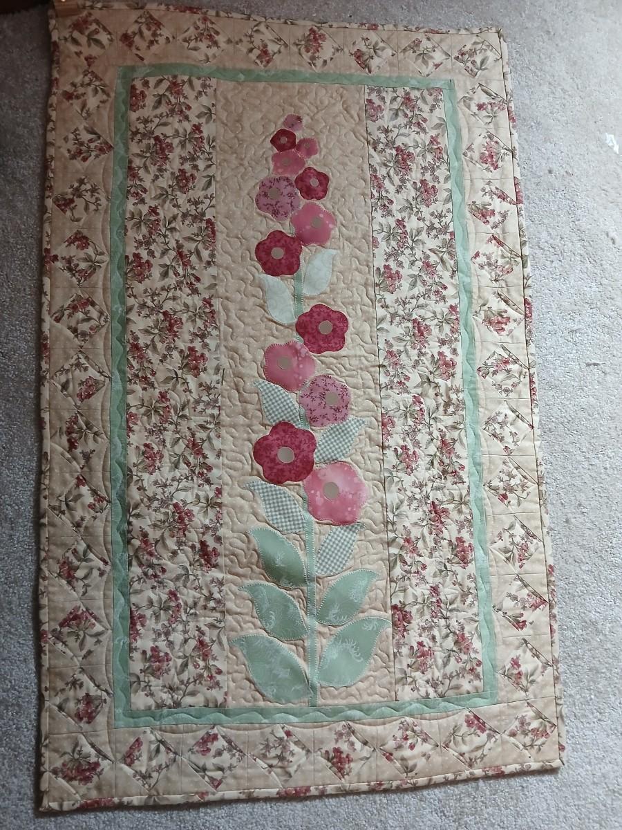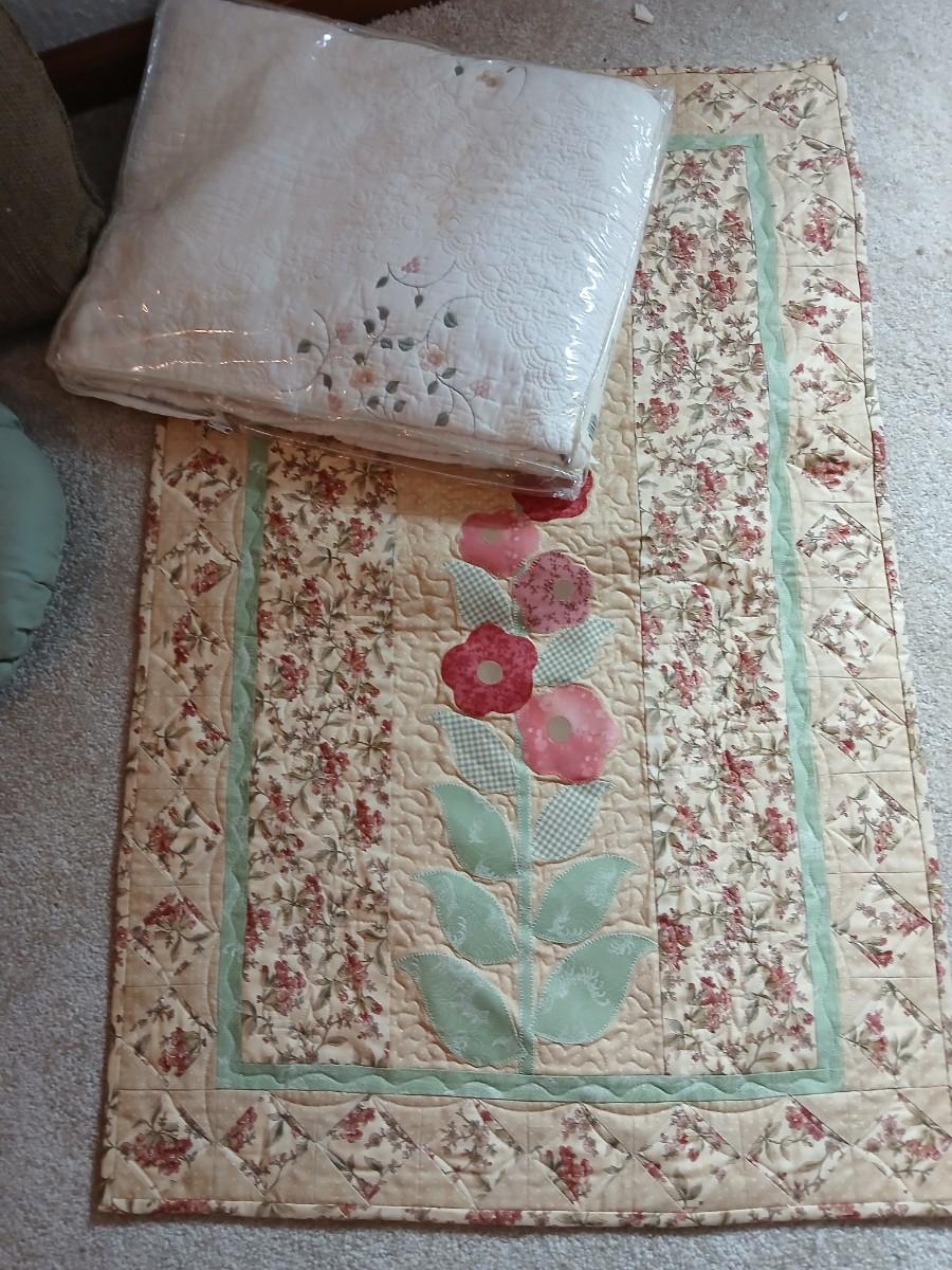 Beautiful Quilt with Quilted wall hanging and several seat / bar stool cusions.