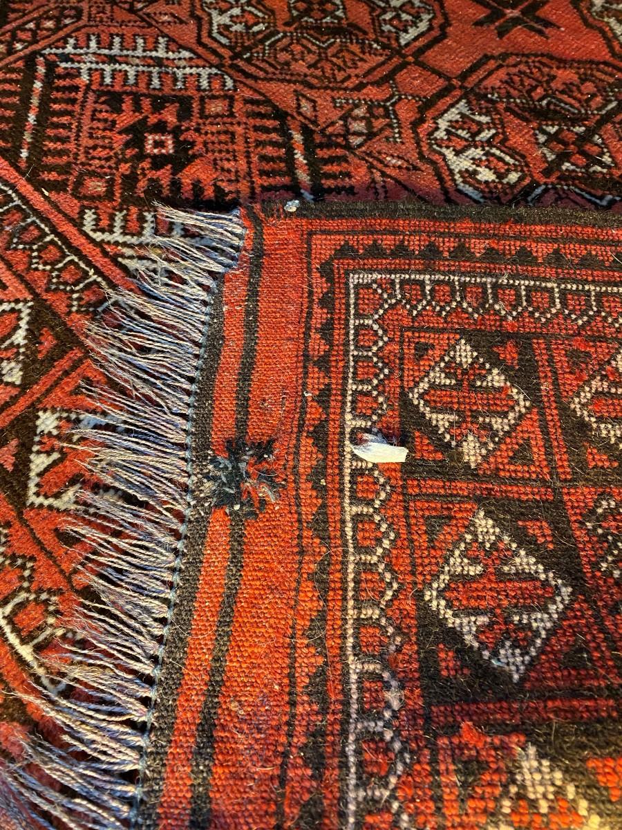 Beautiful Red Burgundy Pattern Hand Woven Area Rug. Intricate pattern with red, black, and white. In very good condition.