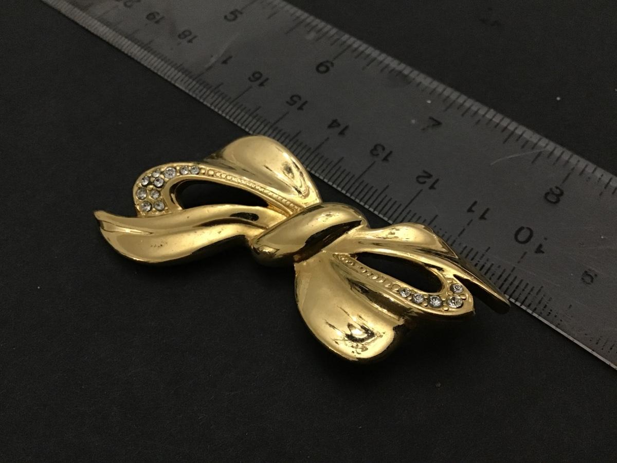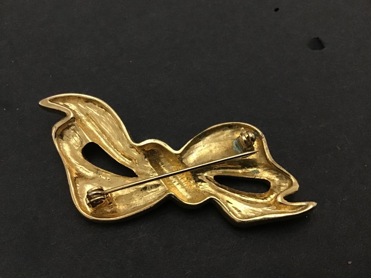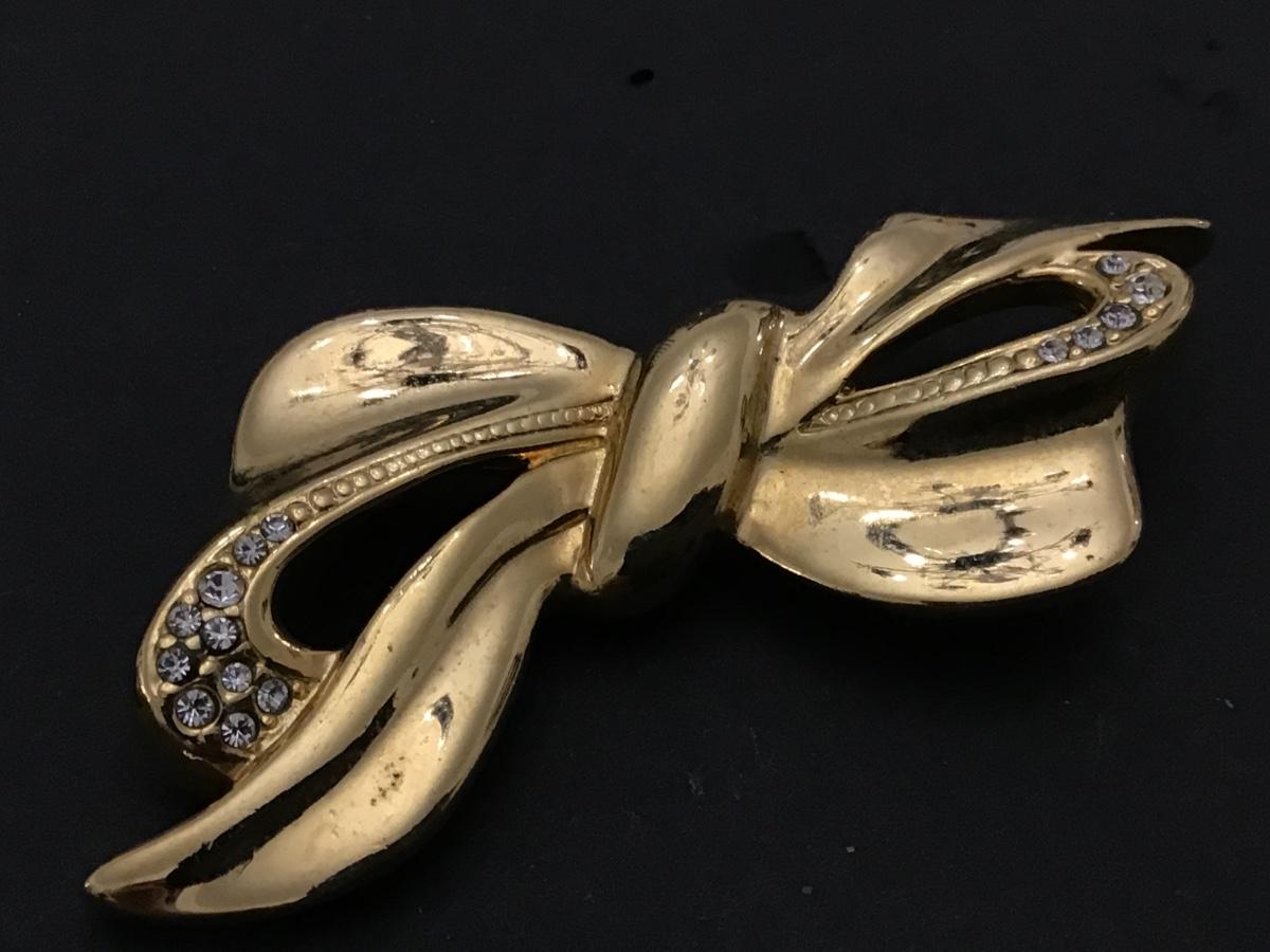 Beautiful Rhinestone Gold Tone Ribbon Brooch