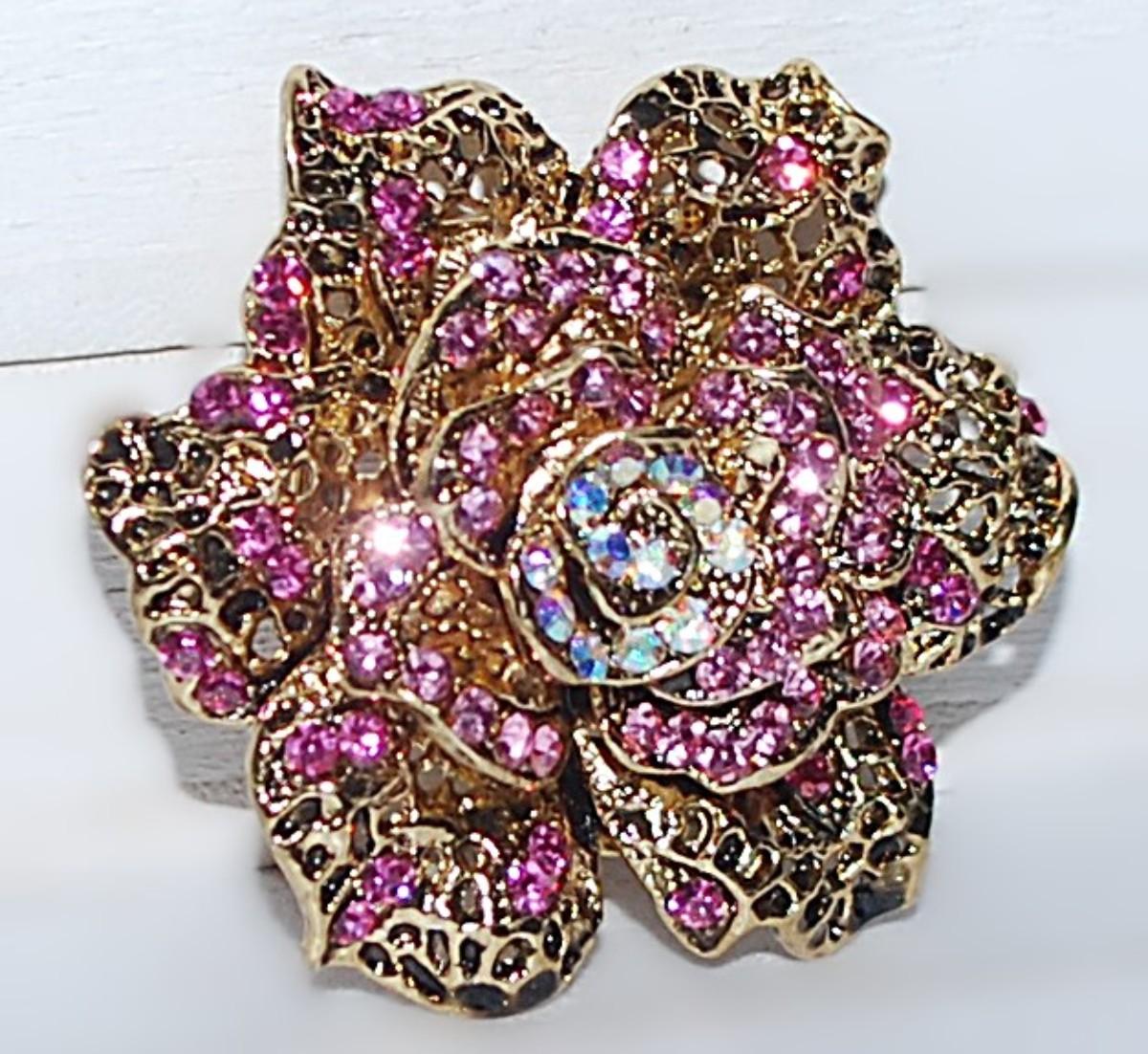 Beautiful ROSE STYLE BROOCH (2" Diam.) with Iridescent and Pink Stone Center & Gold Colored Petals and SNAP CLOSURE on a Gold Tone Setting