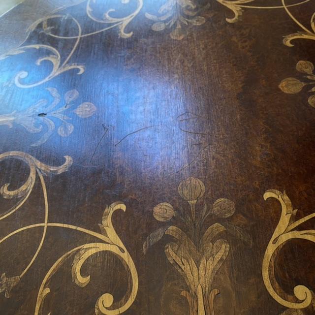 26” Round x 29” H / Some surface scratches - see photo / Inlayed accents on top