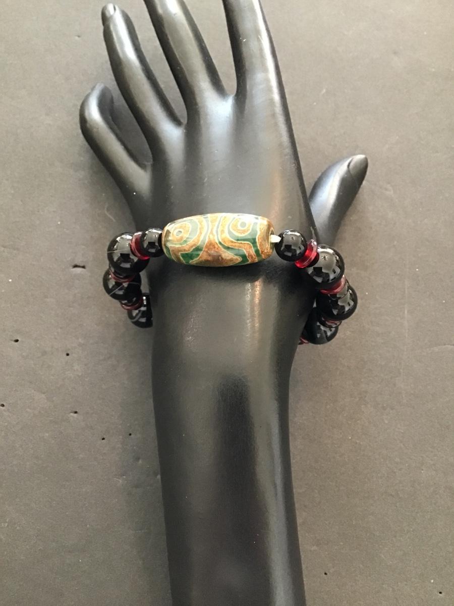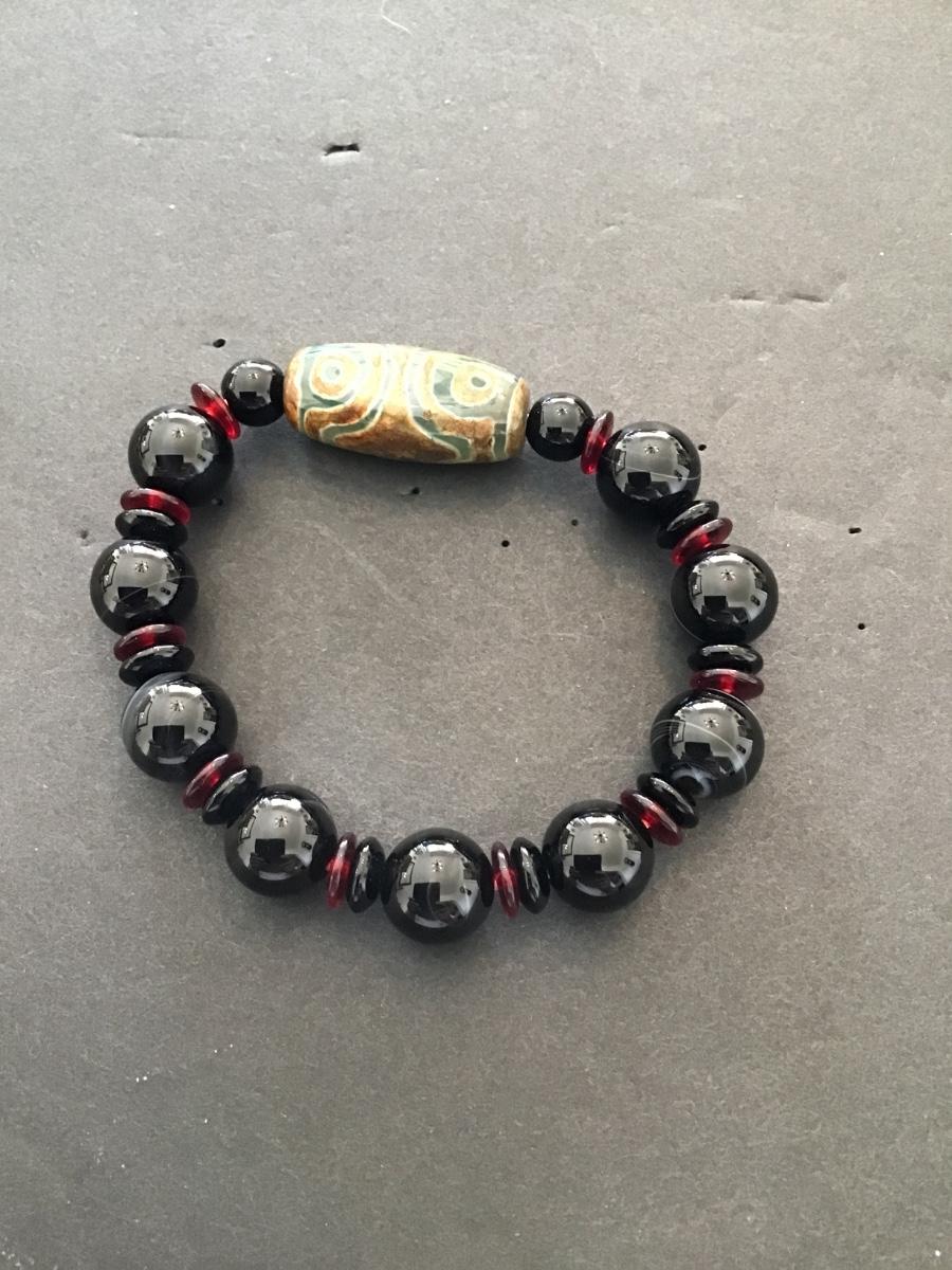Beautiful ruby red and black glass beaded bracelet with ceramic. Please see attached photos.