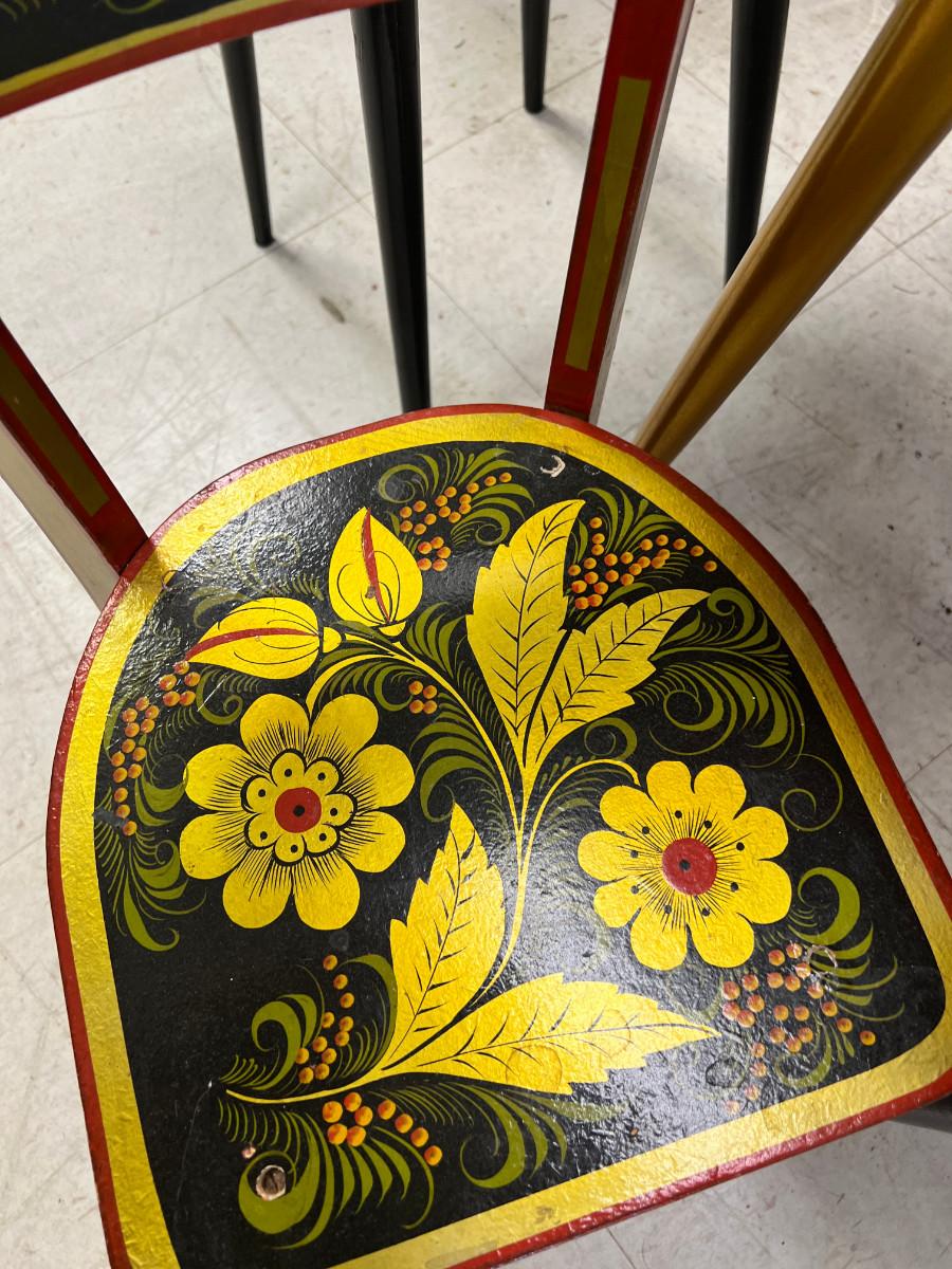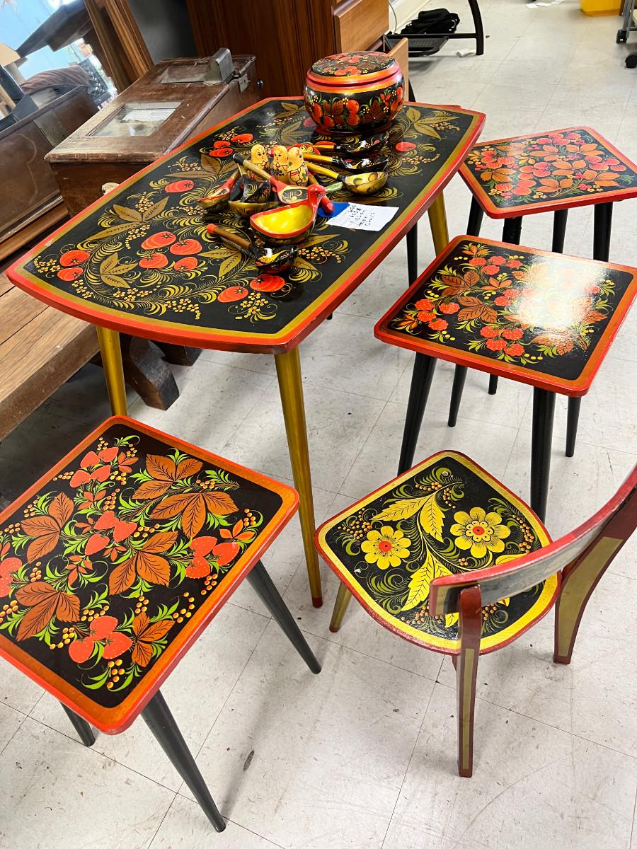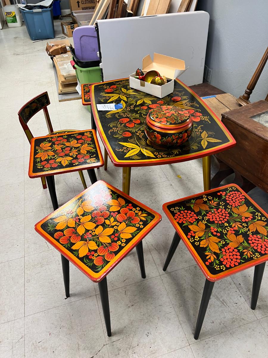 Painted in vibrant colors . legs come off table, there is one little child's chair and the entire set is kids size, but not made for play. This is an unusual set and in very good condition perfect for the right setting. There is no reserve on this item .