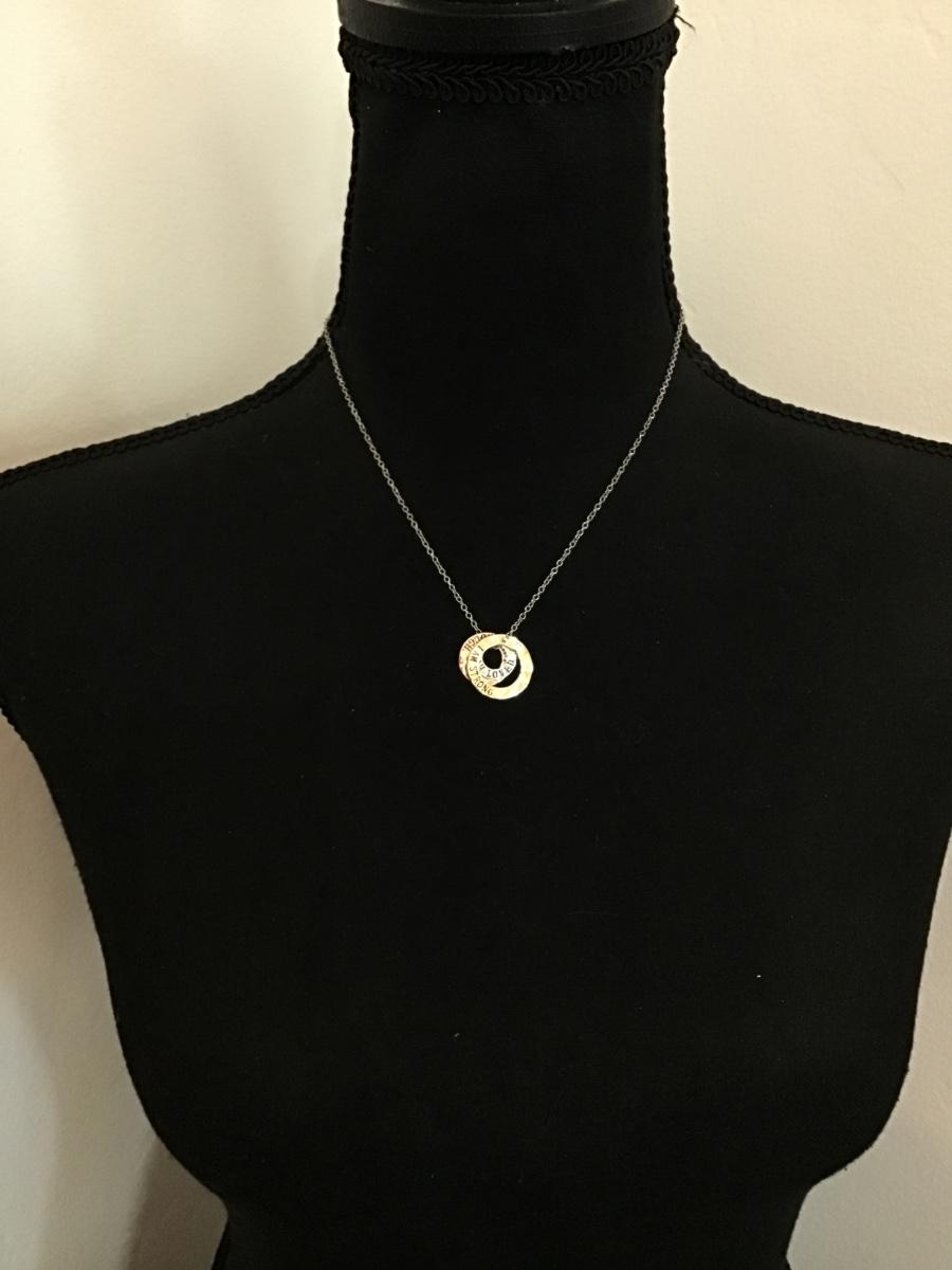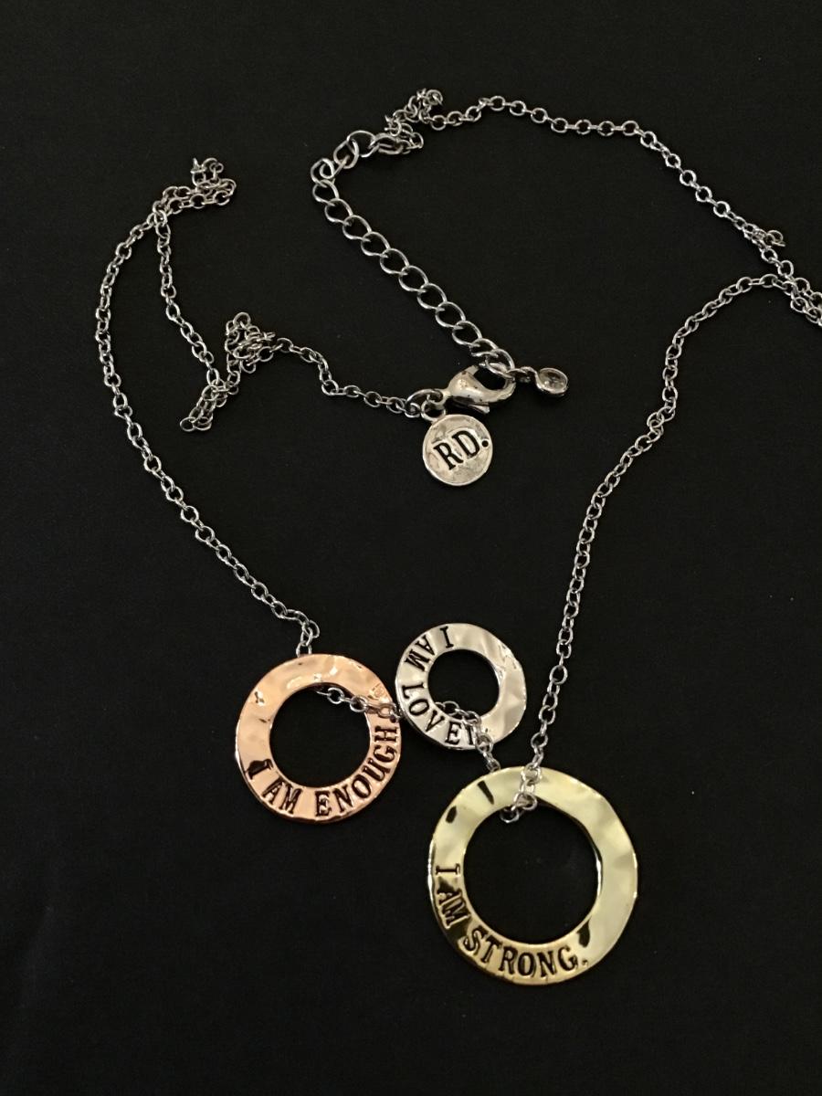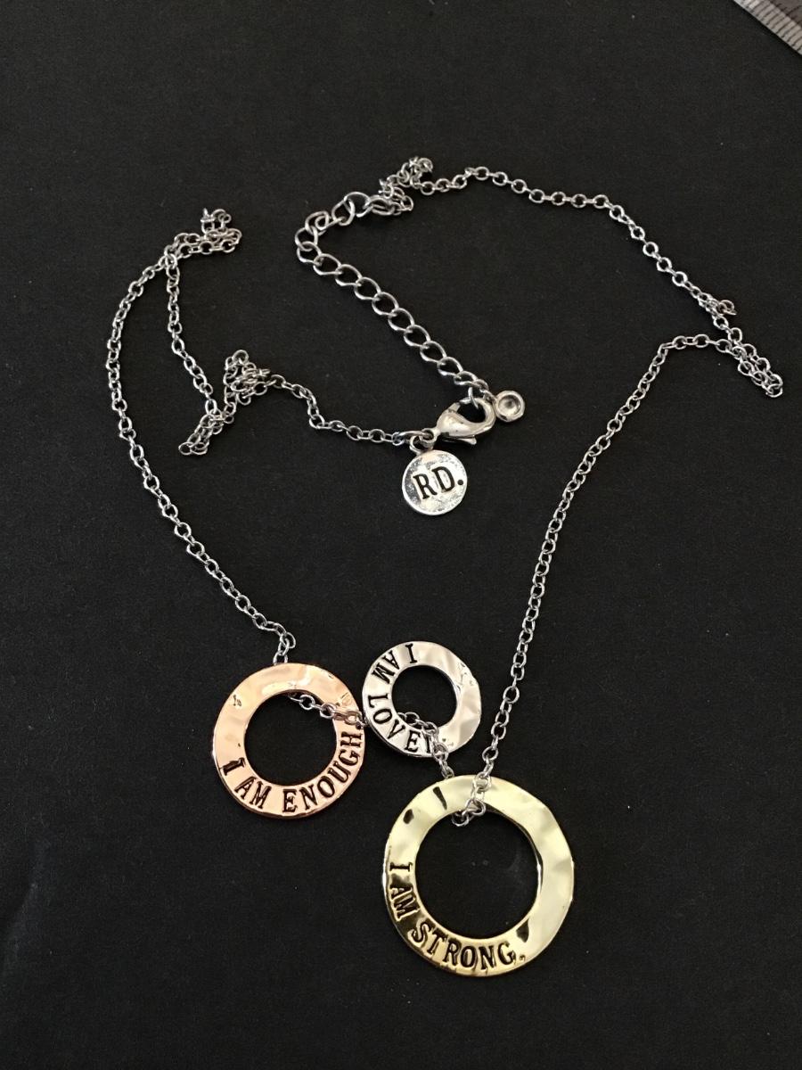 Beautiful, signed, rose, gold, toned, silver, and gold toned. I am strong I am loved. I am enough fashion necklace.