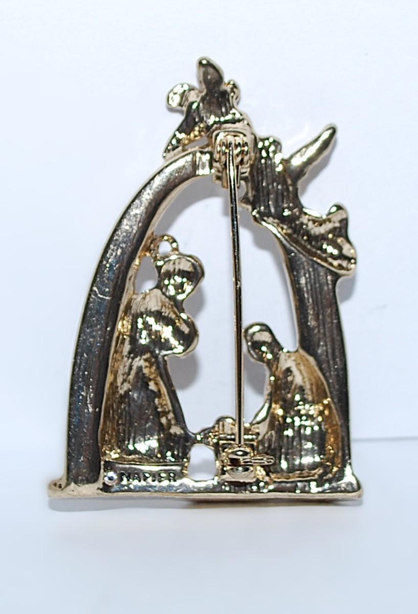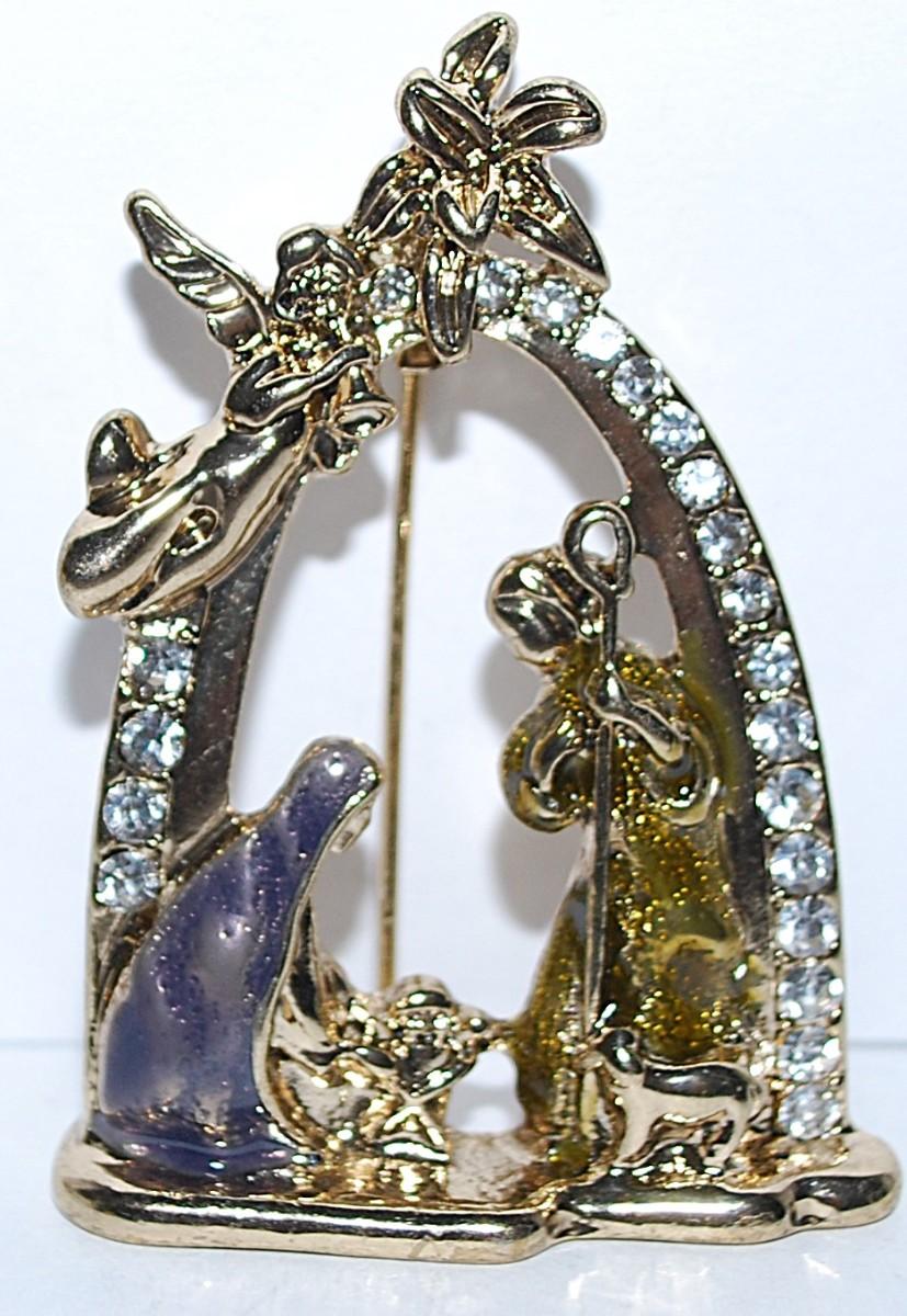 BEAUTIFUL Silver & Gold Colored NATIVITY BROOCH (2¼" x 1½") with Angels & Blue Shawl "Mary" on a Gold Tone Setting