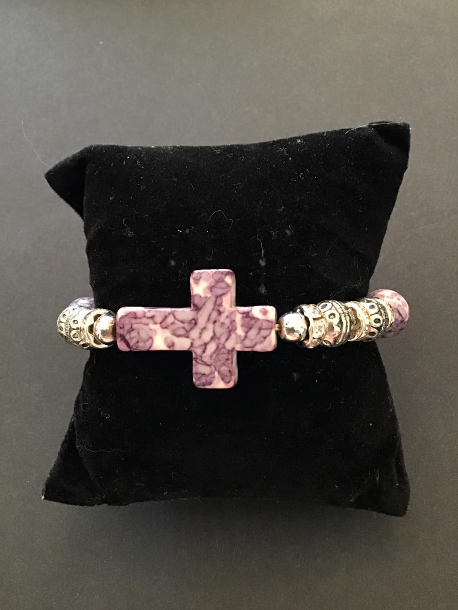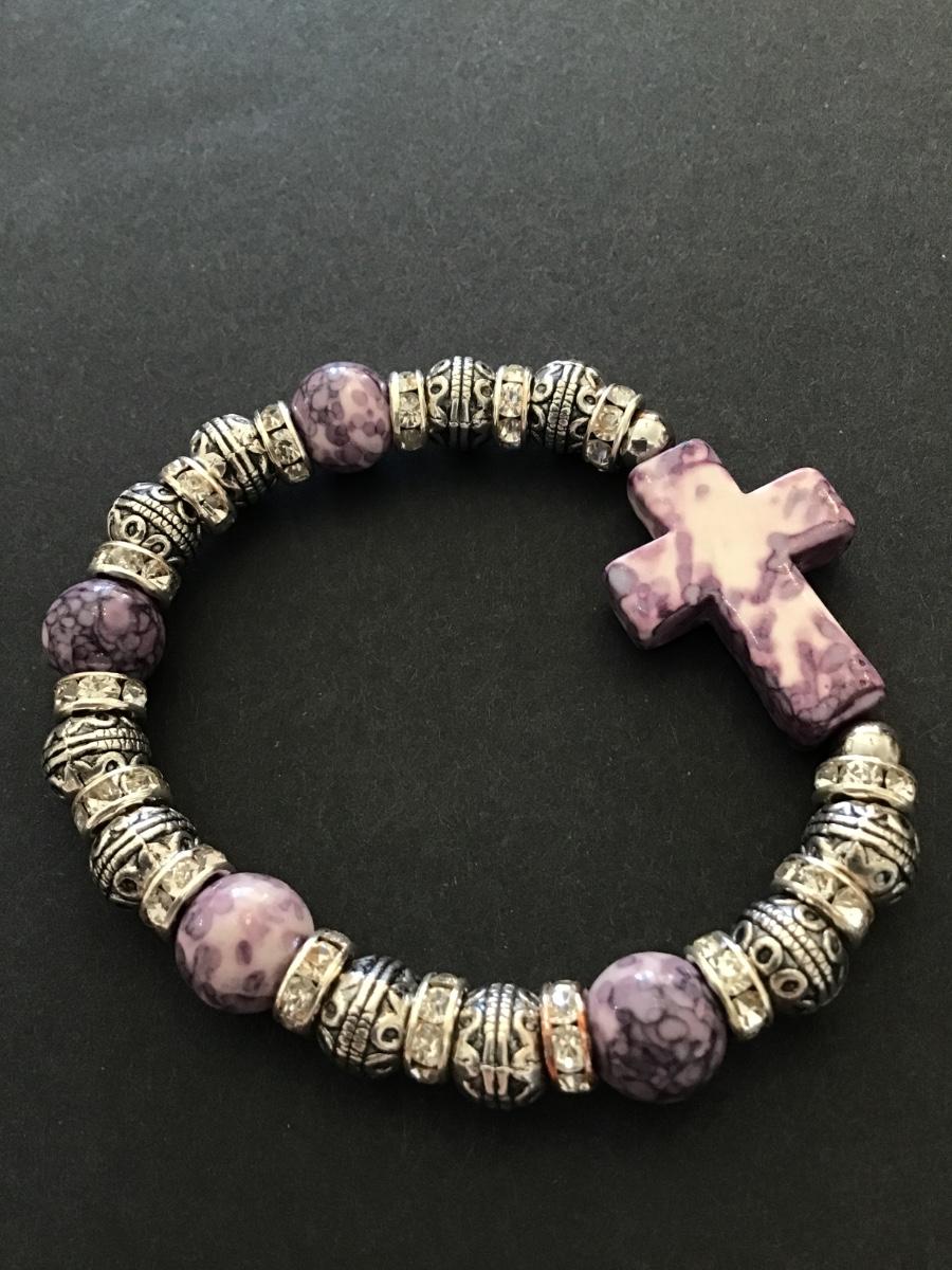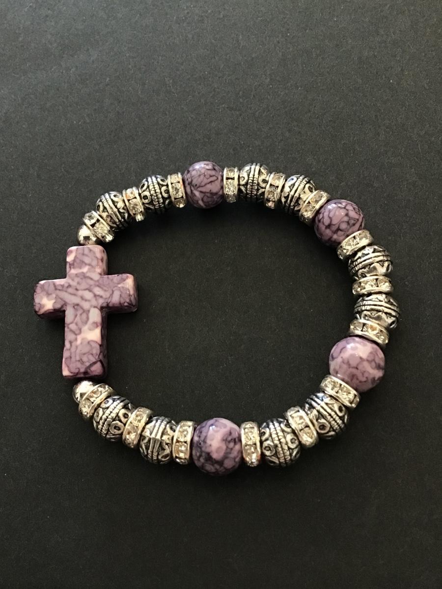 Beautiful silver tone metal bead and purple gemstone stretch bracelet