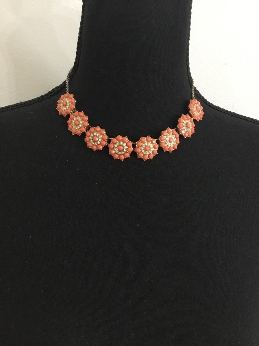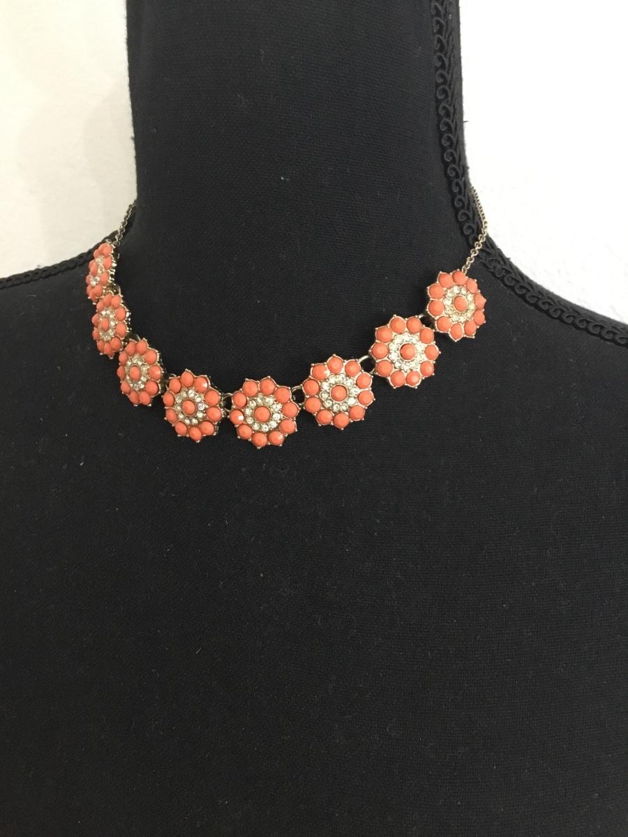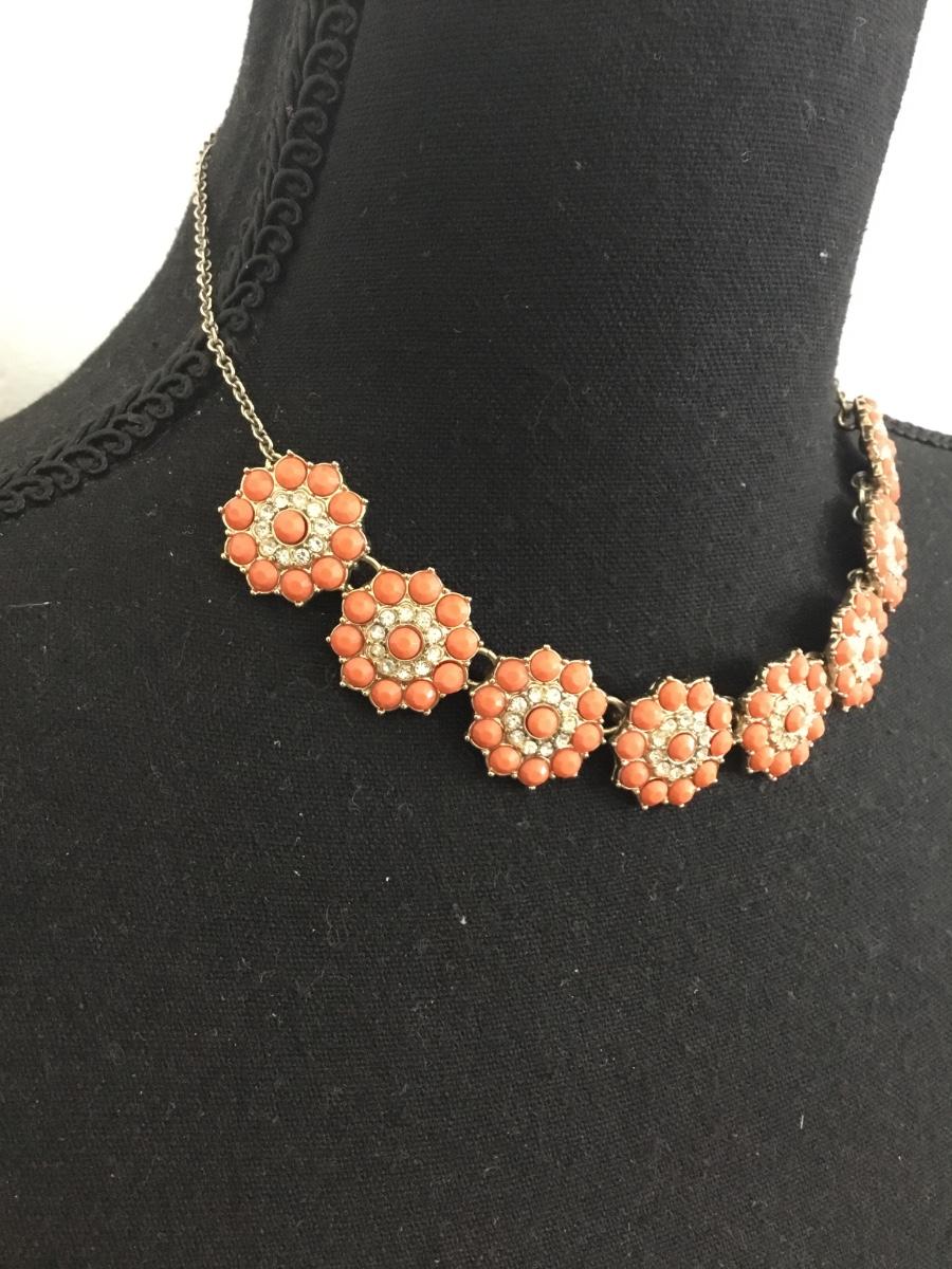 Beautiful Silver tone,, premier design, coral peach with rhinestone flower statement necklace