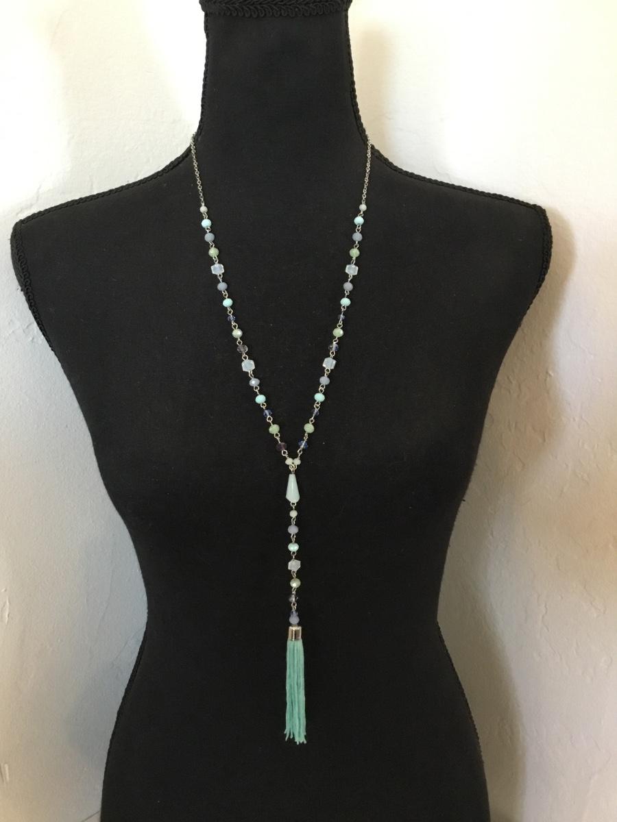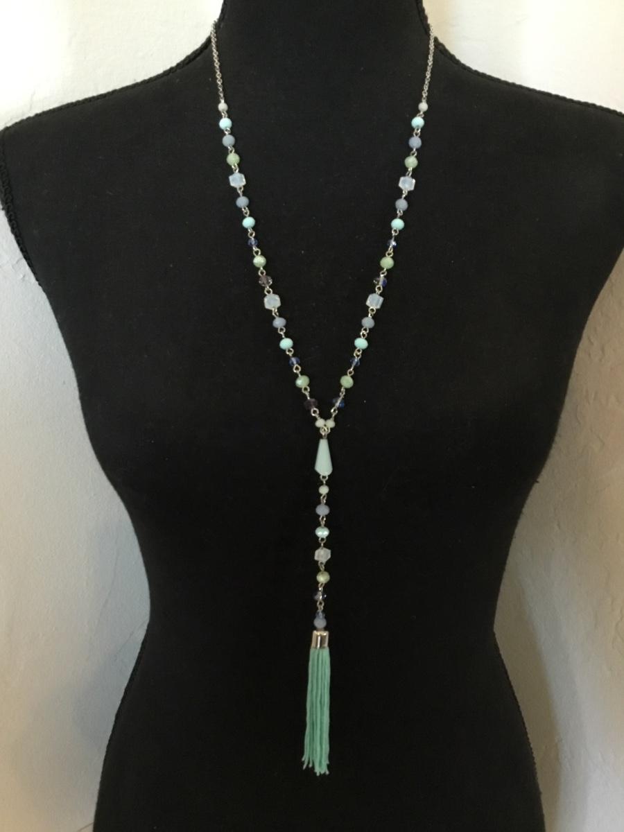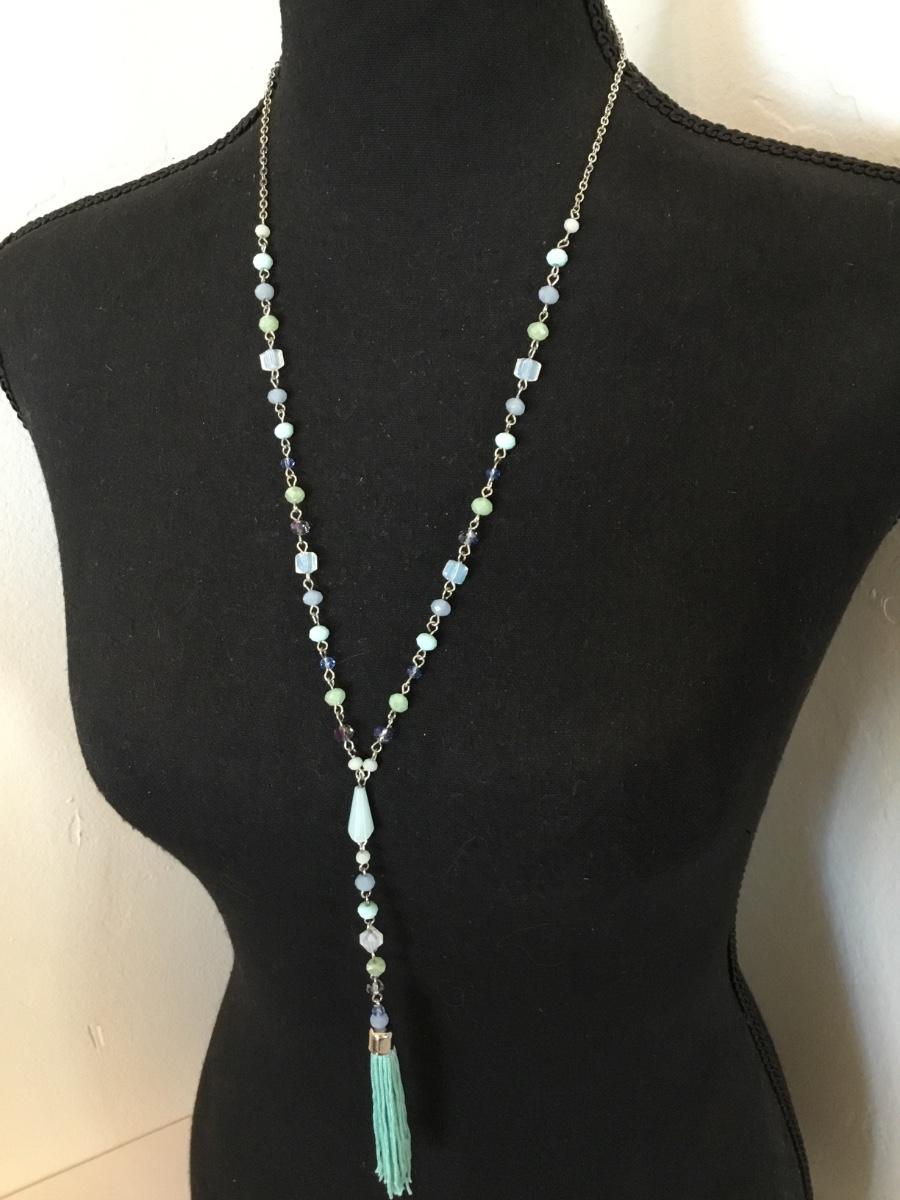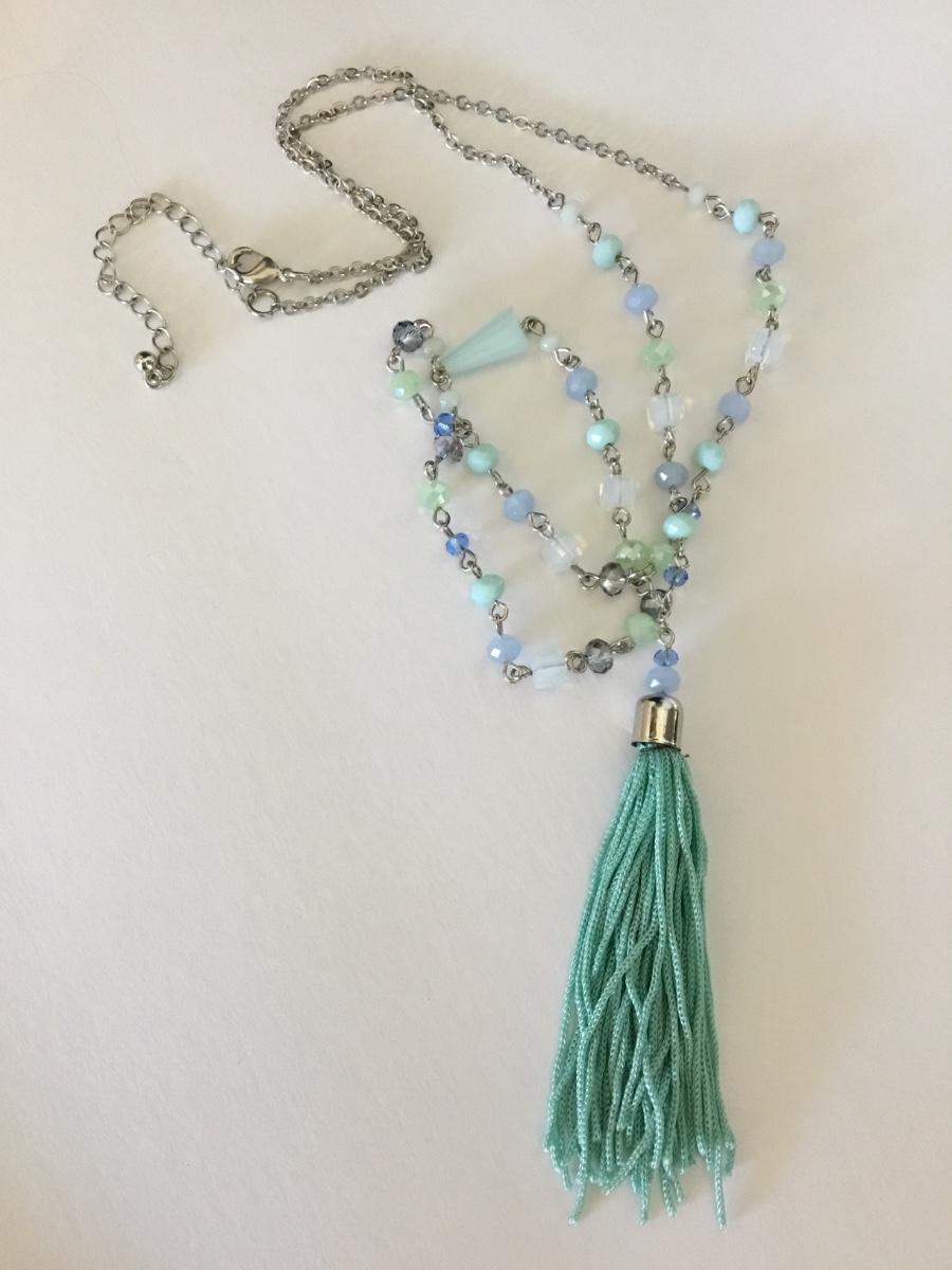 Beautiful, Silver tone, sea green glass bead, crystal tassel necklace