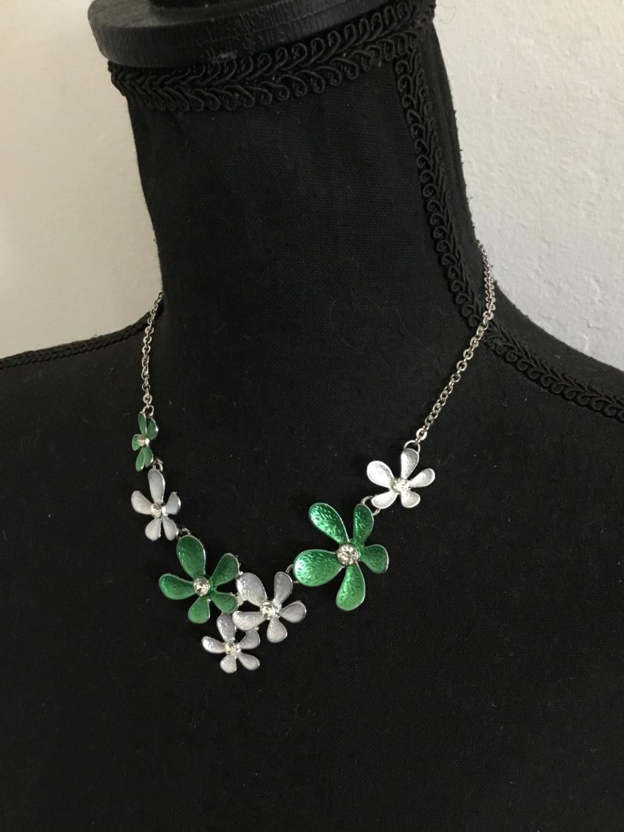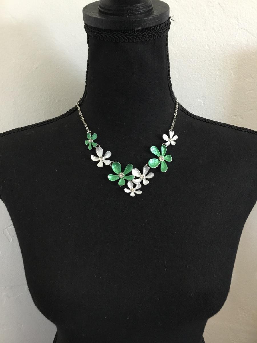 Beautiful, silver tone, silver green flower, rhinestone statement necklaces