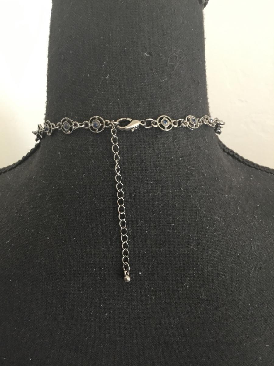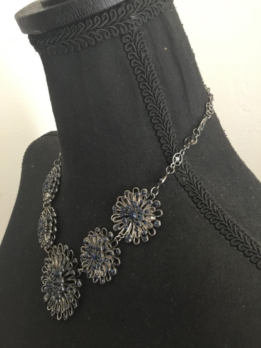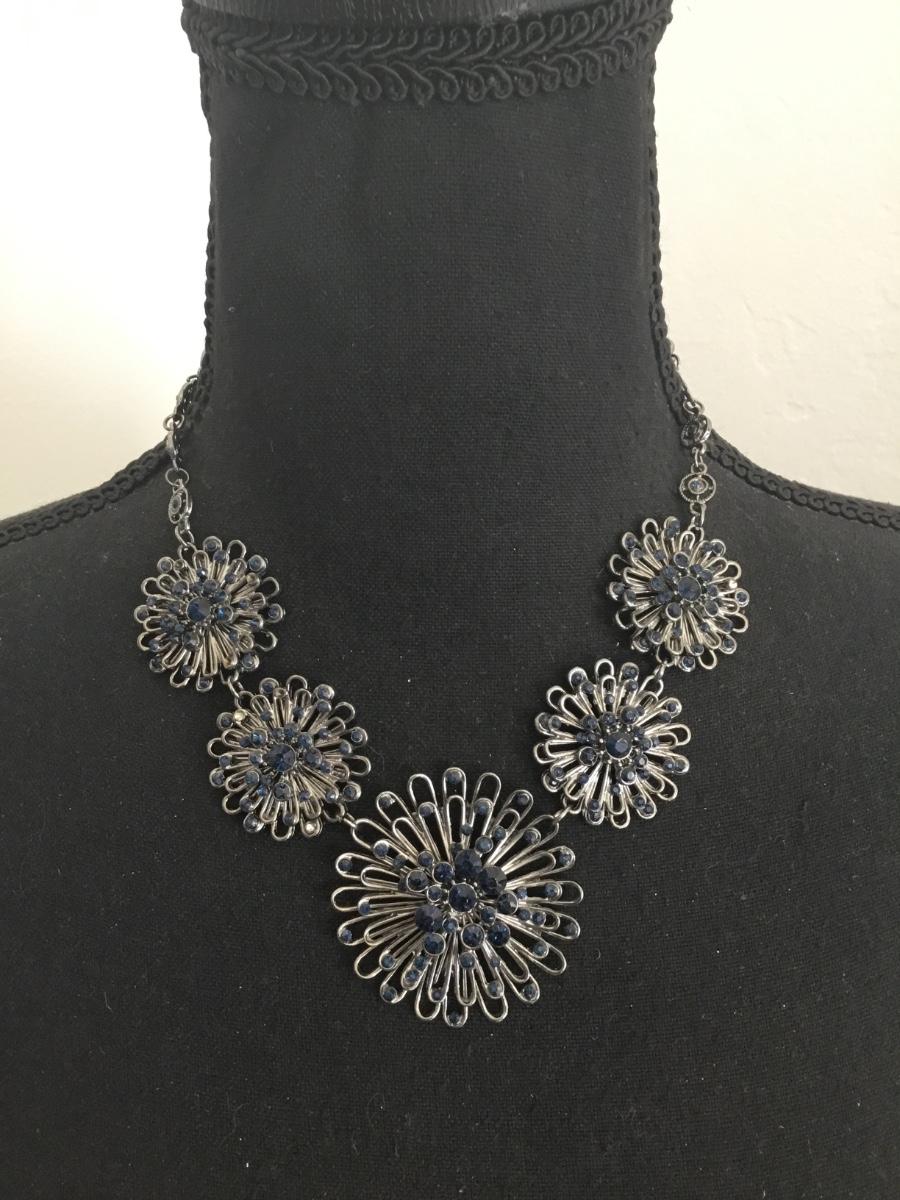 Beautiful, silver toned, dark blue, rhinestone flower statement, necklace