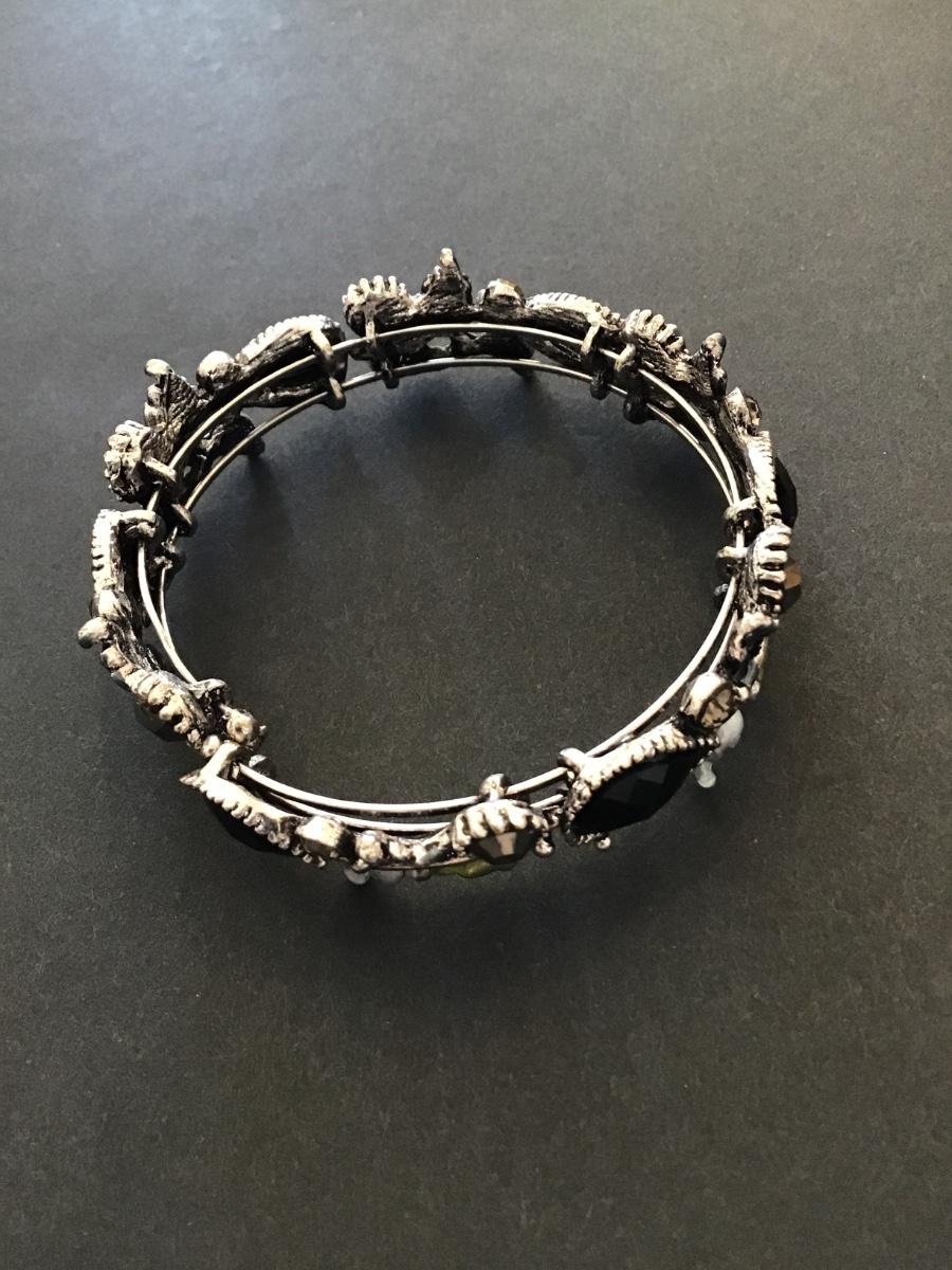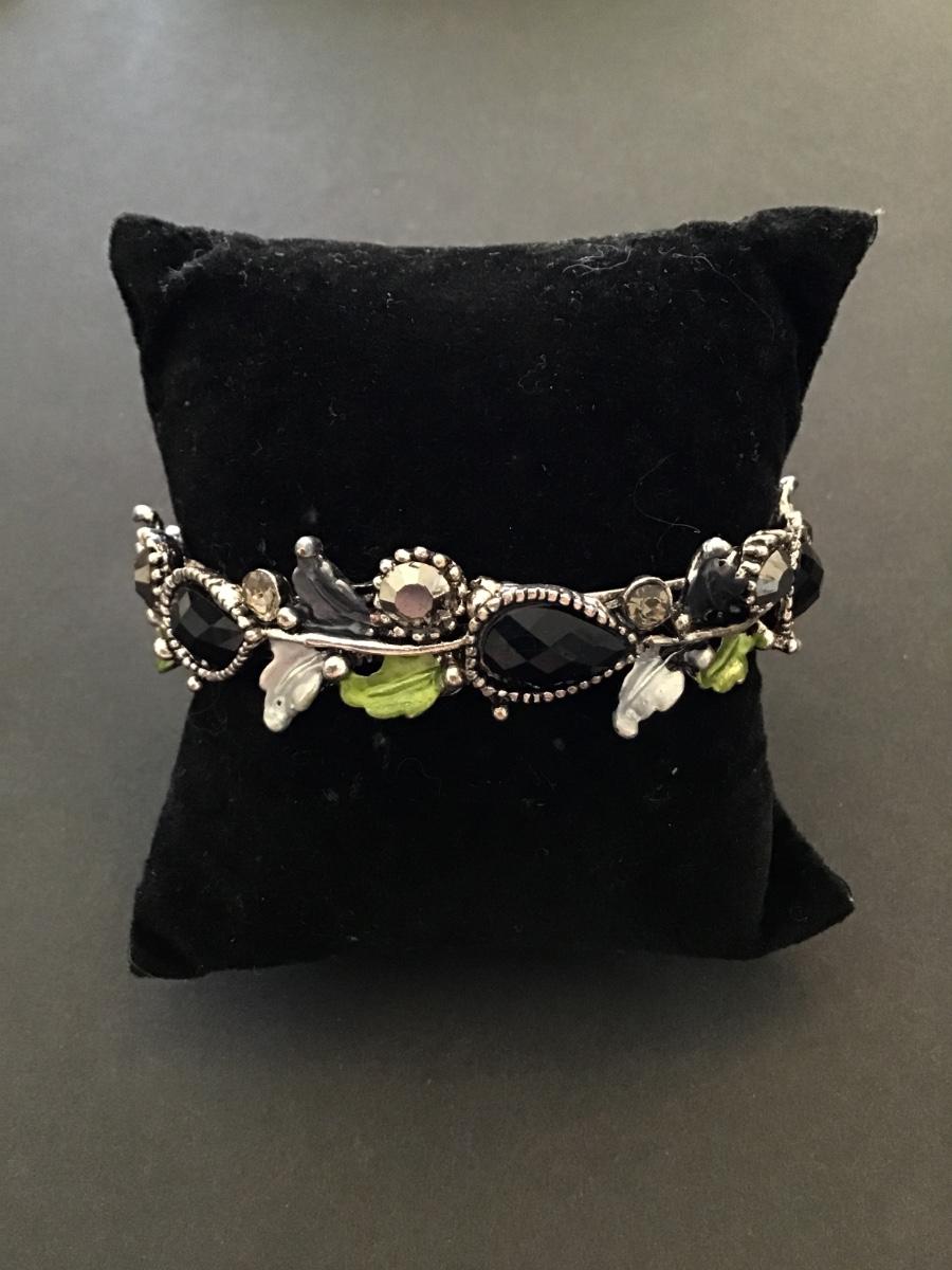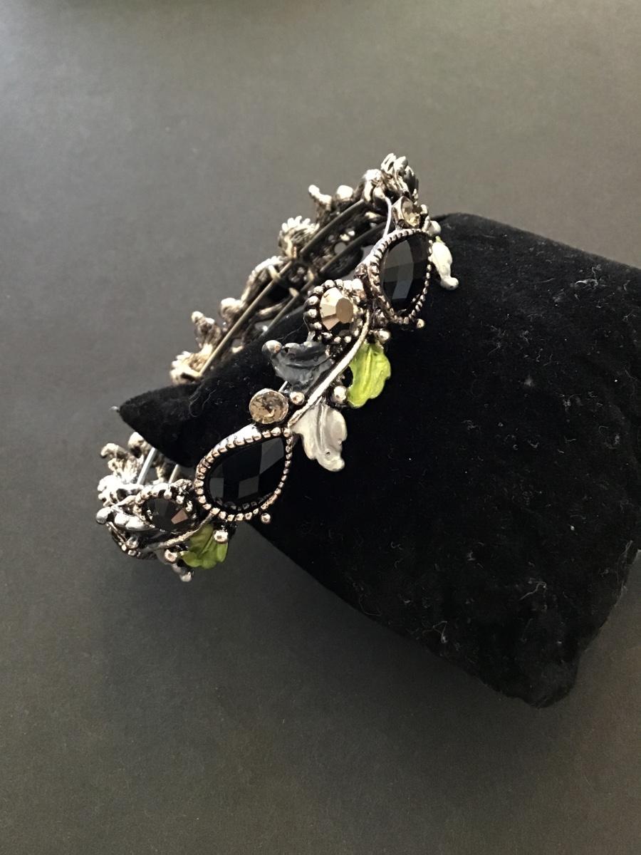 Beautiful silver toned jet black Rhinestone leaf hinged bangle bracelet