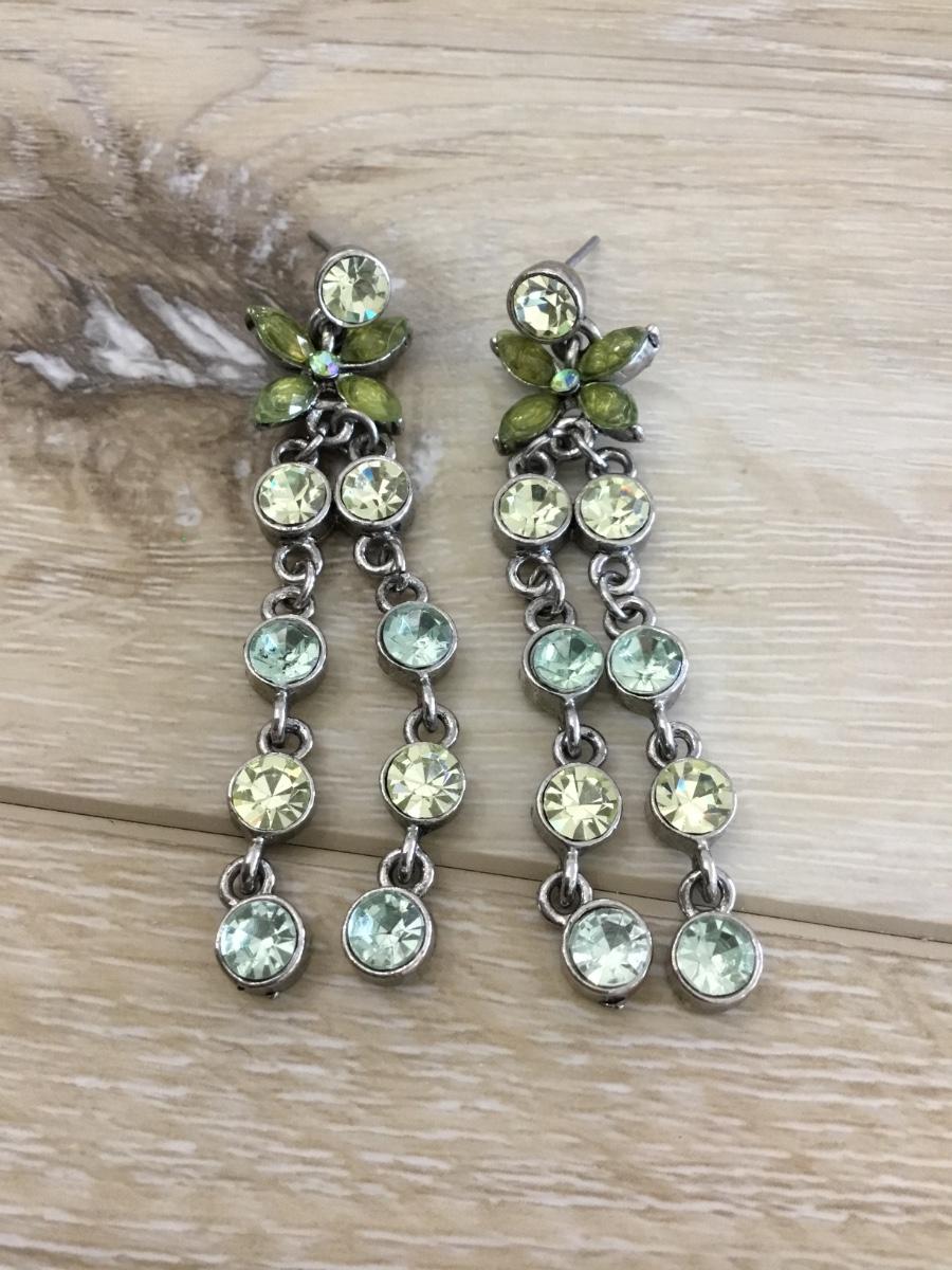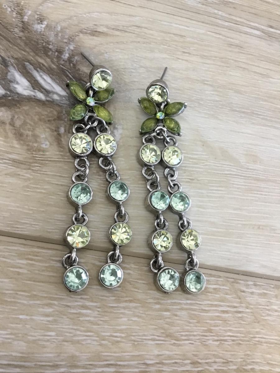 Beautiful, silver toned light olive and light green gem stone drop dangle earrings
