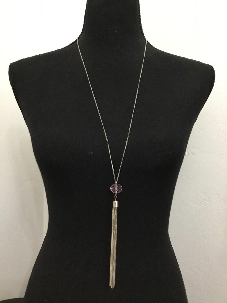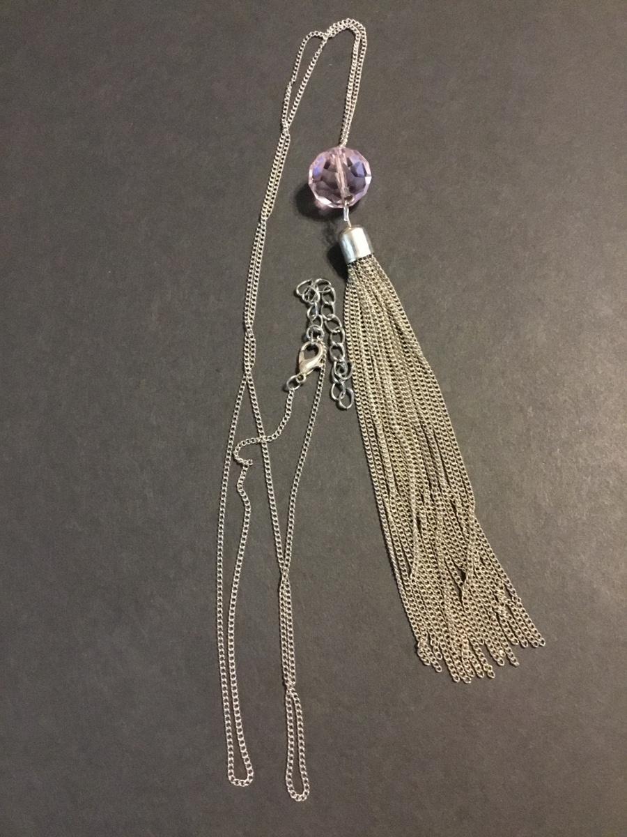 Beautiful, silver toned, light, pink, crystal tassel necklace