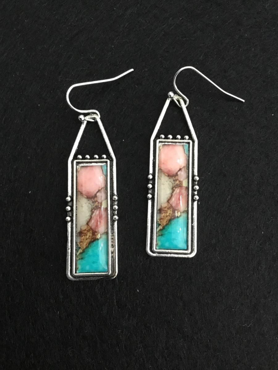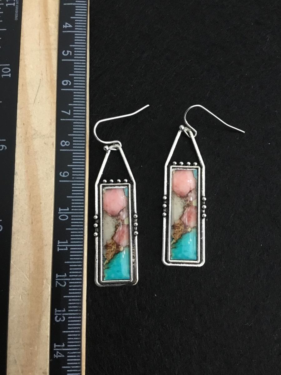 Beautiful Silver toned , marbled, turquoise, pink and white dangle earrings