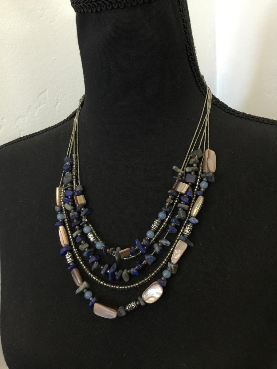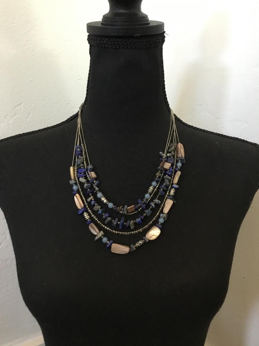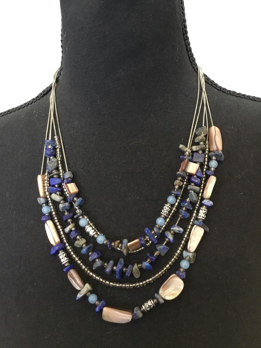 Beautiful, silver toned, multistrand, lapis, and shell bead statement necklace