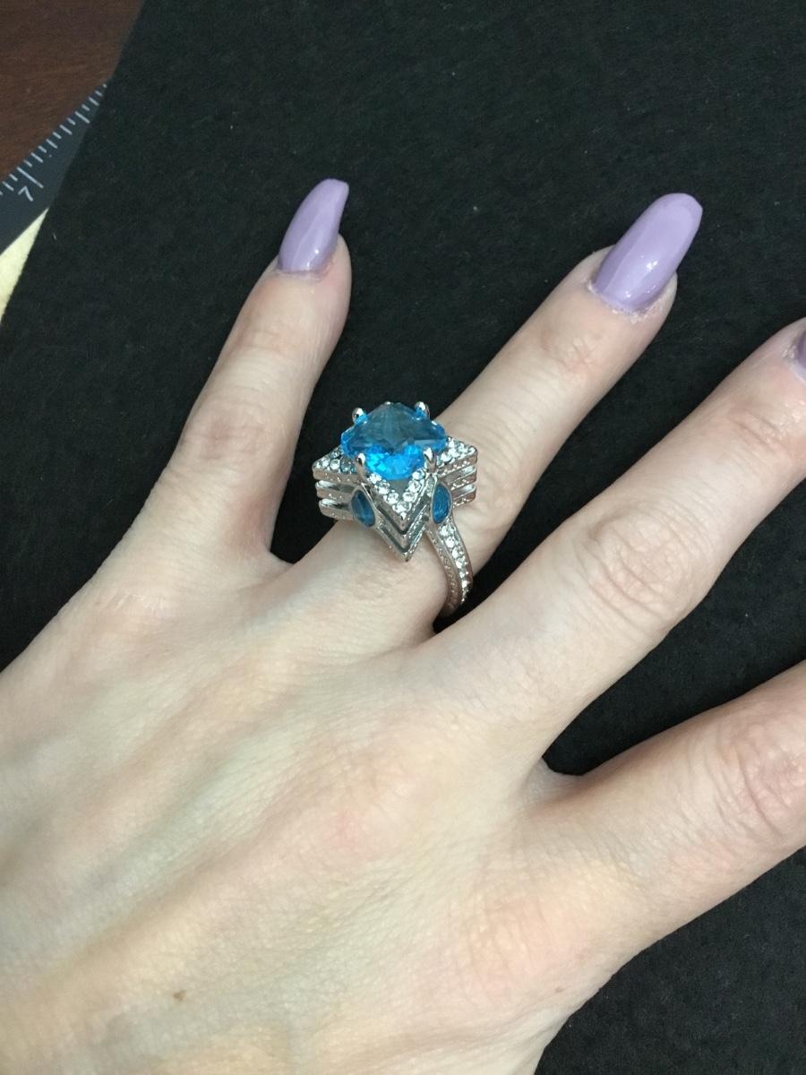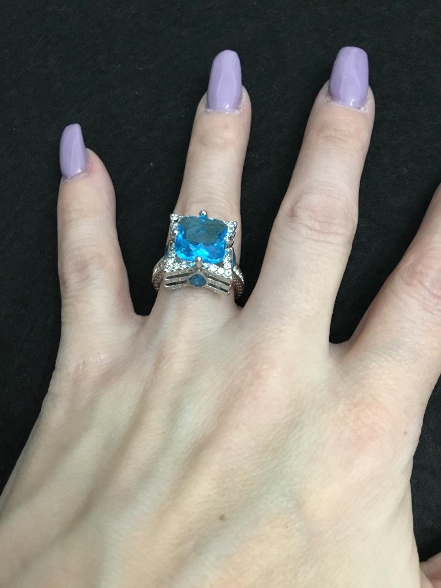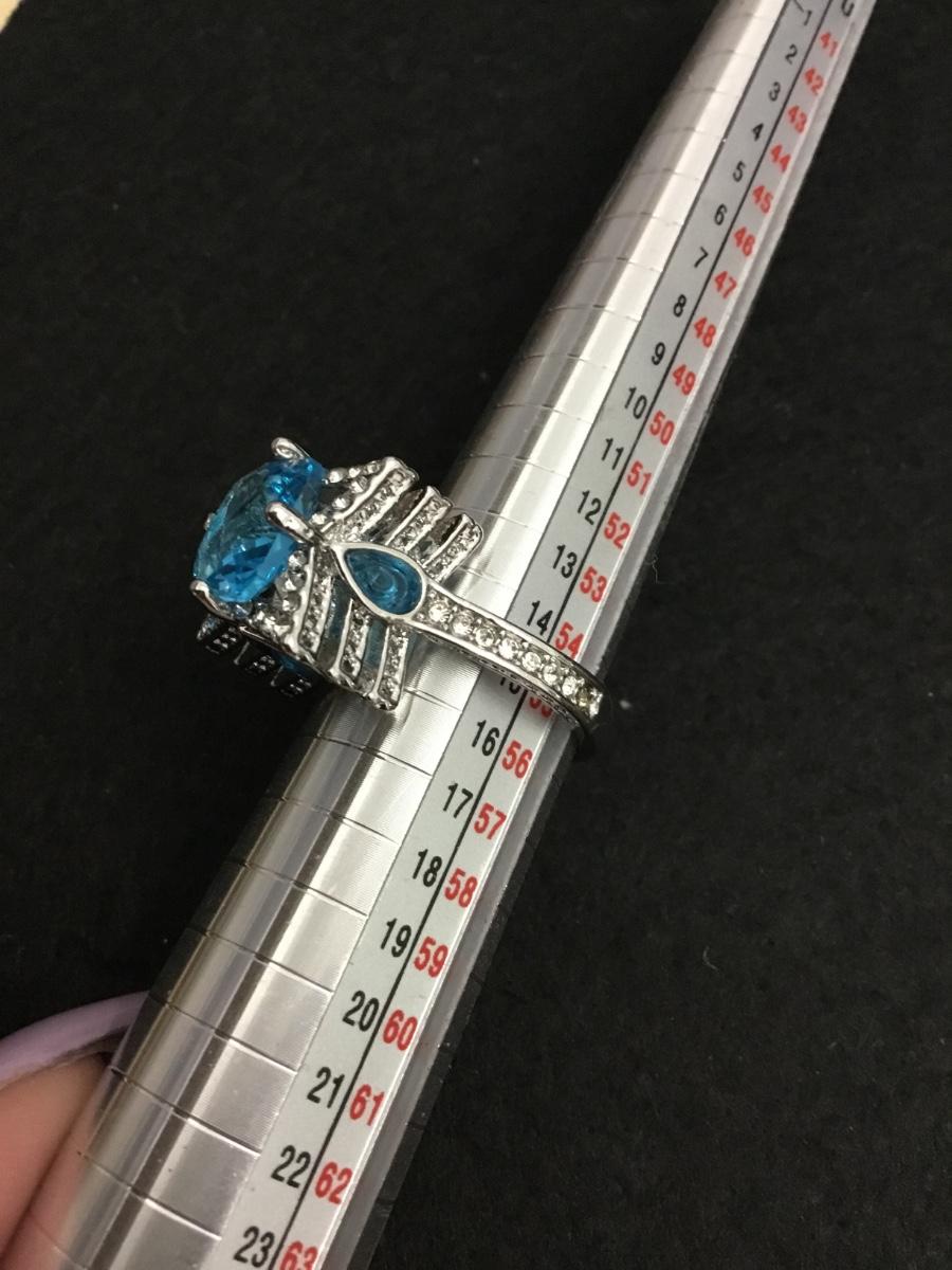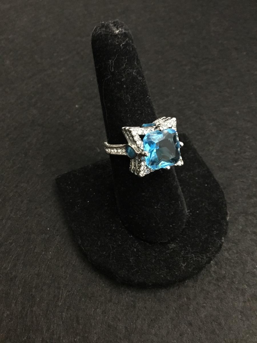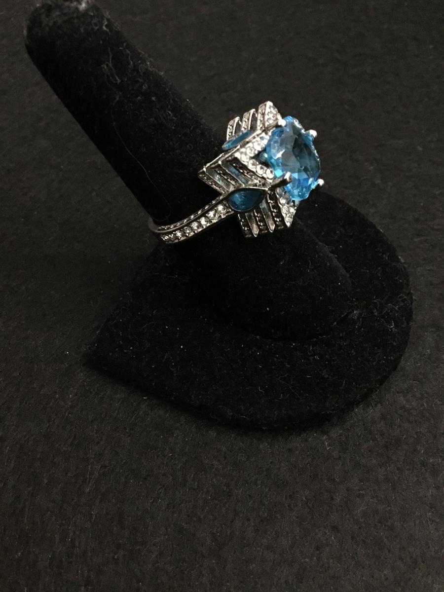 Beautiful, silver toned well-made, very detailed, three tiered light ocean blue Centerstone fashion ring