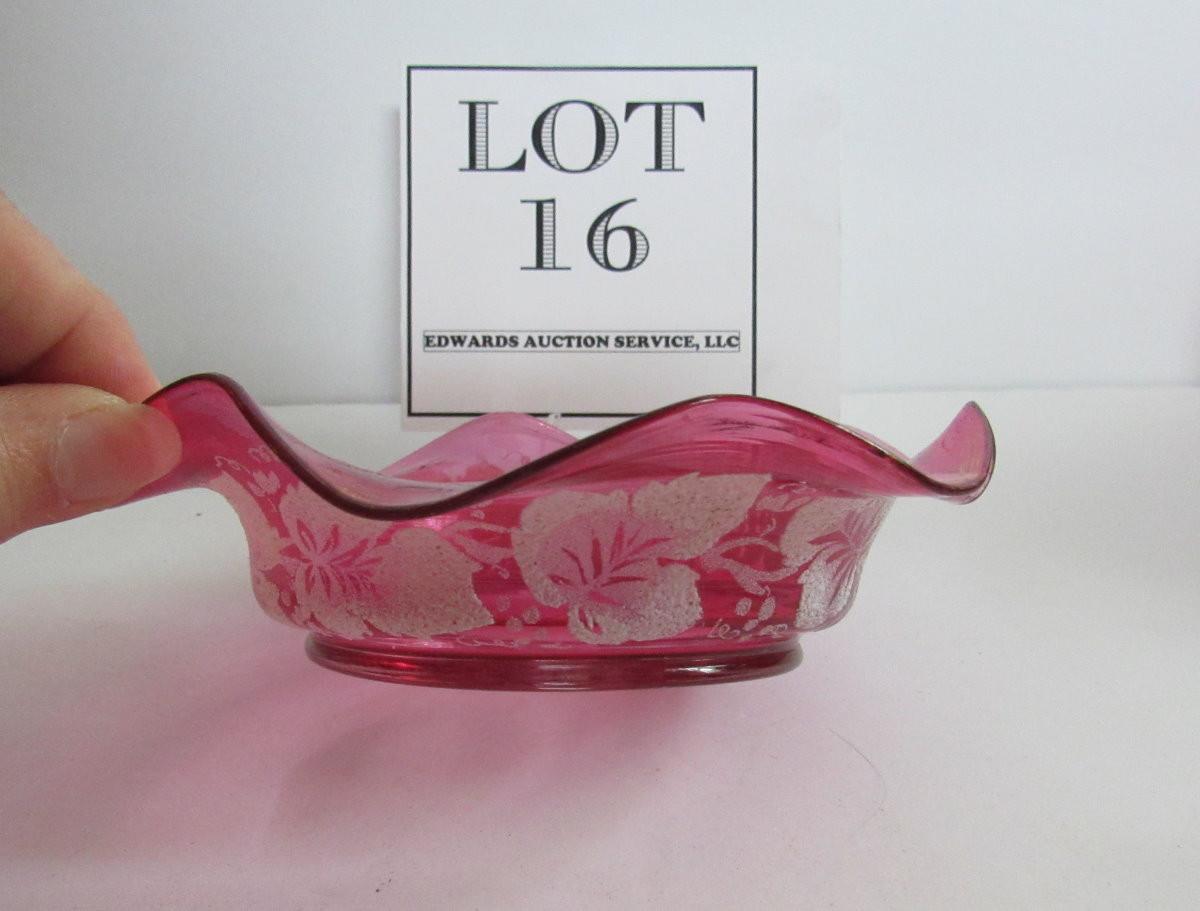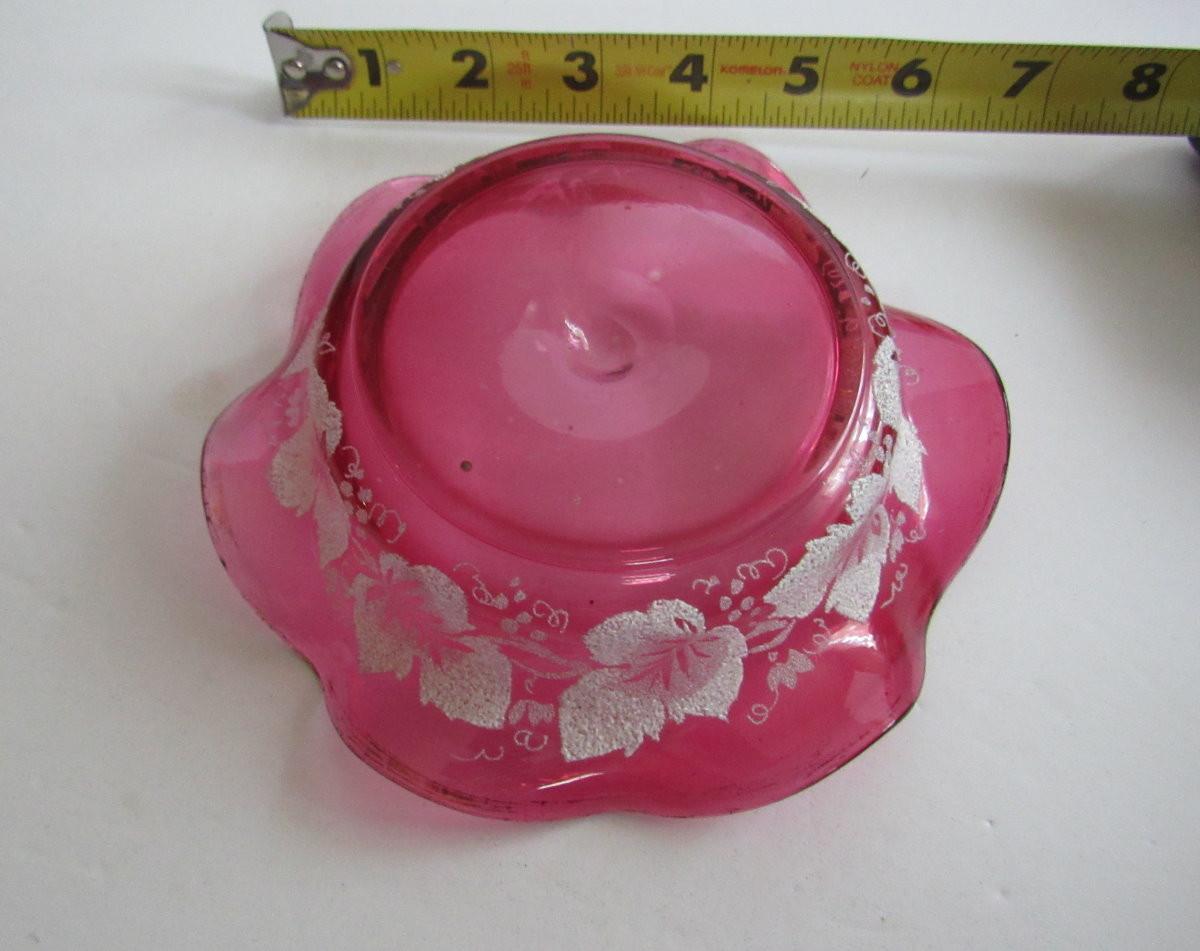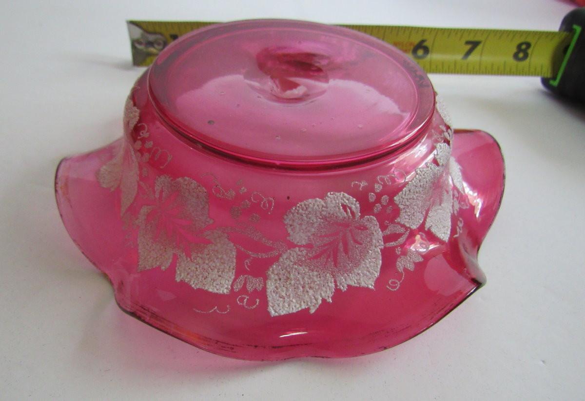 Beautiful Small Antique Cranberry Glass Bowl With Beaded Leaf Finish, Great Pontil