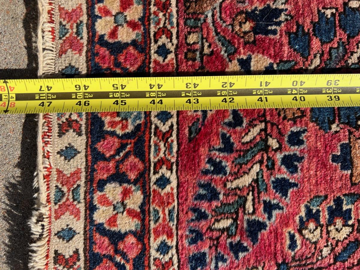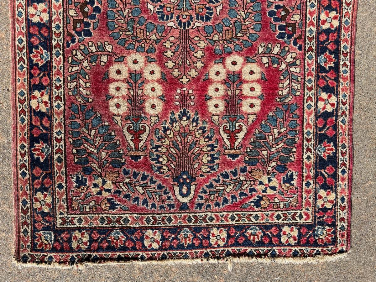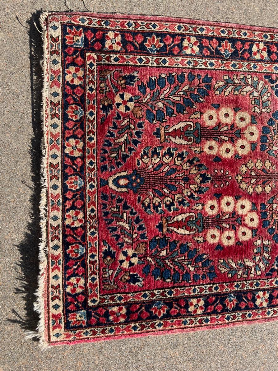 DESCRIPTION: This beautiful area rug has been around long enough to develop the extraordinary wool sheen that comes with age and even wear. The rich, over-all wine-red field of the rug is detailed with a formal floral spray pattern and is framed with a single foliate border.