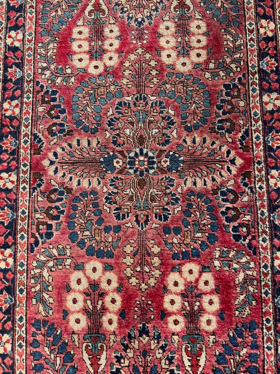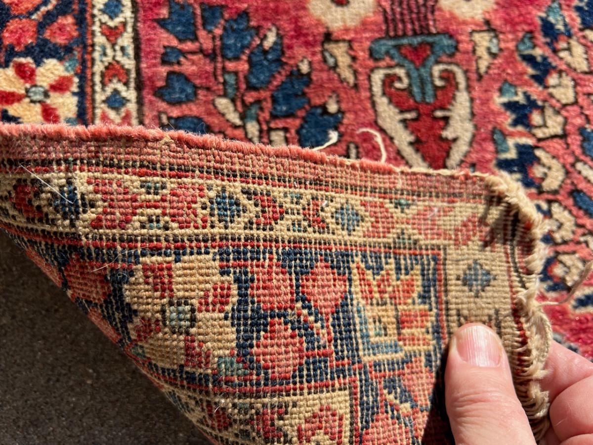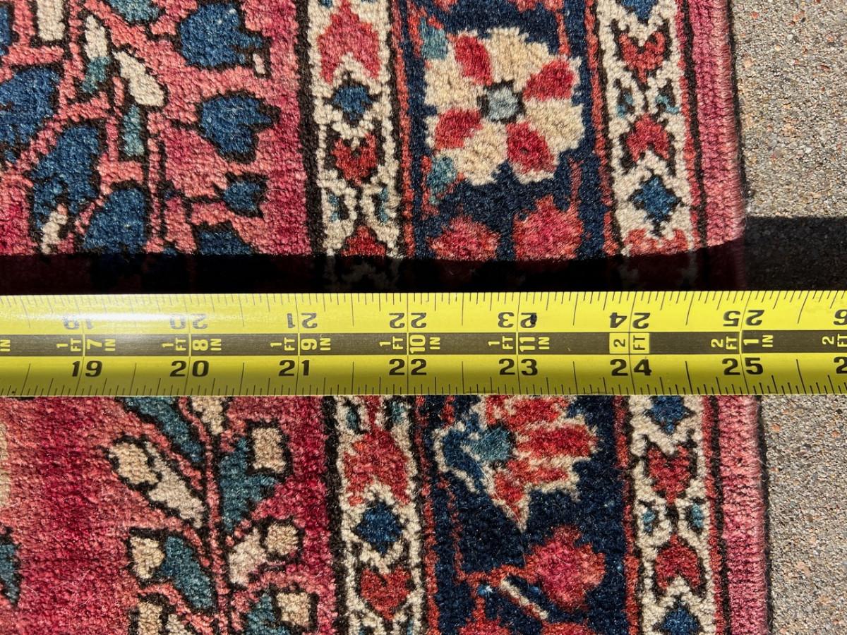 DESCRIPTION: This beautiful area rug has been around long enough to develop the extraordinary wool sheen that comes with age and even wear. The rich, over-all wine-red field of the rug is detailed with a formal floral spray pattern and is framed with a single foliate border.