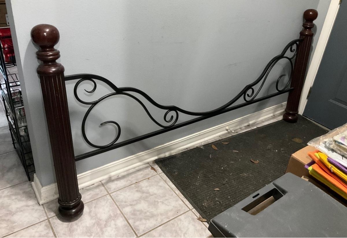 Beautiful solid oak (stained cherry) & heavy iron king size headboard & footboard with rails included. All hardware included also. Renaissance style. Pick up in Mandeville. $300.
